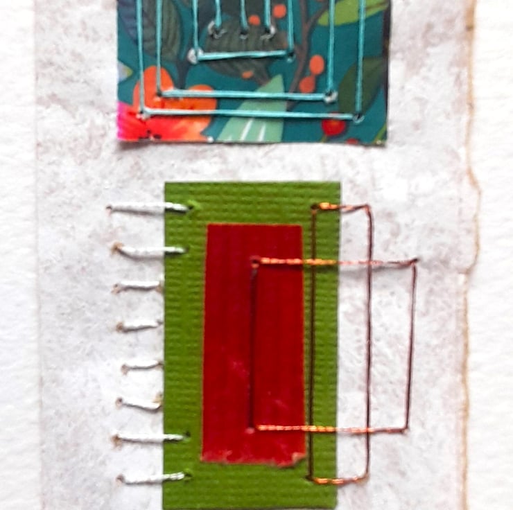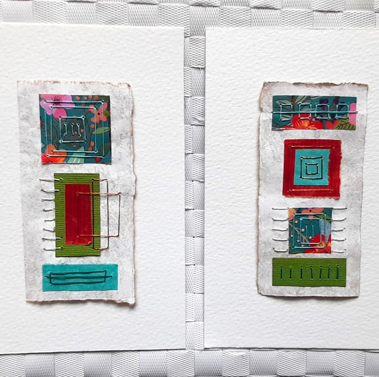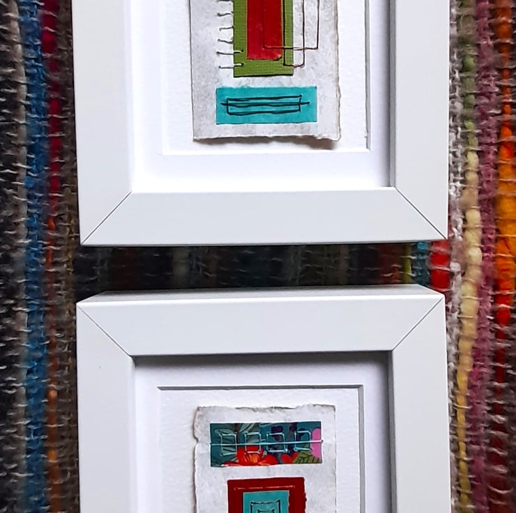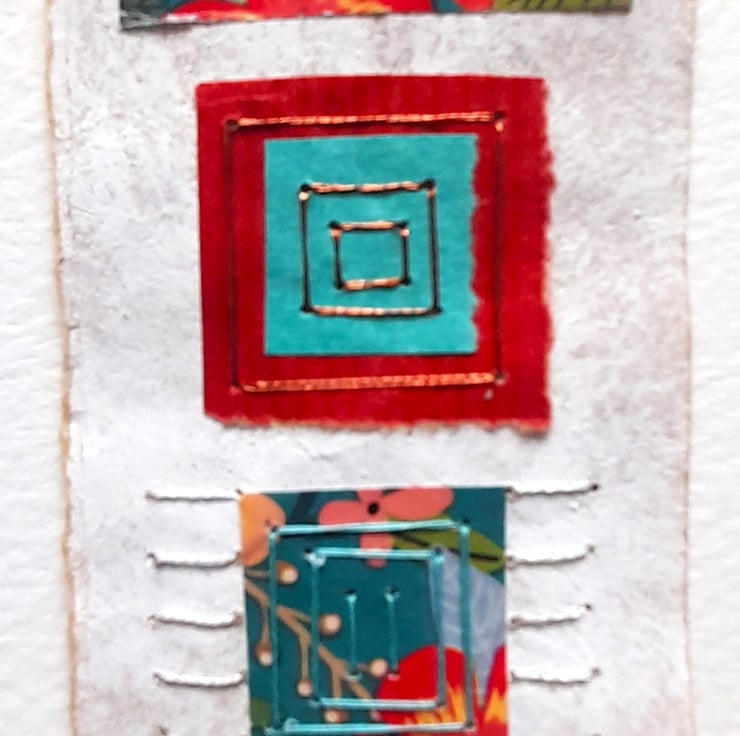 My Pretty Patterns Squares & Rectangles are original handmade mixed media abstract artworks from my Handstitched Geometrics Collection. I’ve used a pretty patterned paper in teal, turquoise, green & red. To compliment this, I’ve also used a mix of different papers, tissue, handmade, textured in these colours. I've handstitched over the top to create beautifully simple but really quite interesting little art pieces. The thread compliments the colour combination. The stitches aren’t meant to be perfect, that's the beauty of the pieces being handmade, they soften the structure of the shapes. The needle markings on the paper add another little bit of interest. Mounted on brown wrapping paper textured with white gouache & acrylic paint & white watercolour paper. Some of the paper’s edges have been torn to emphasize the paper texture.