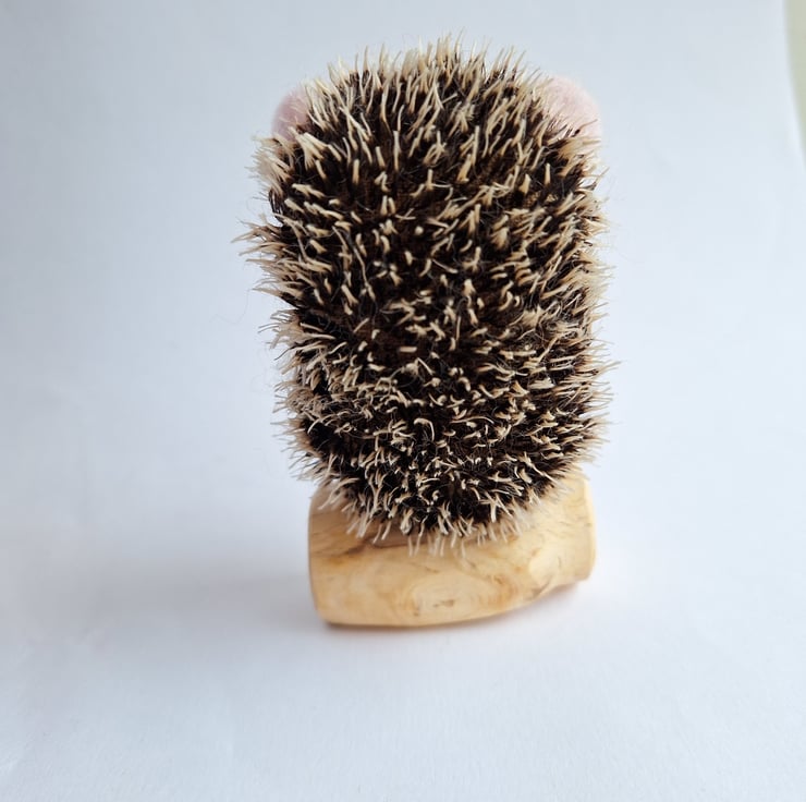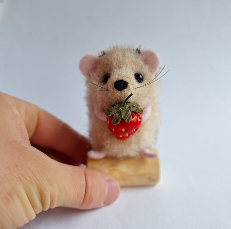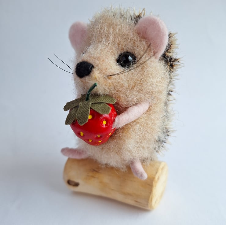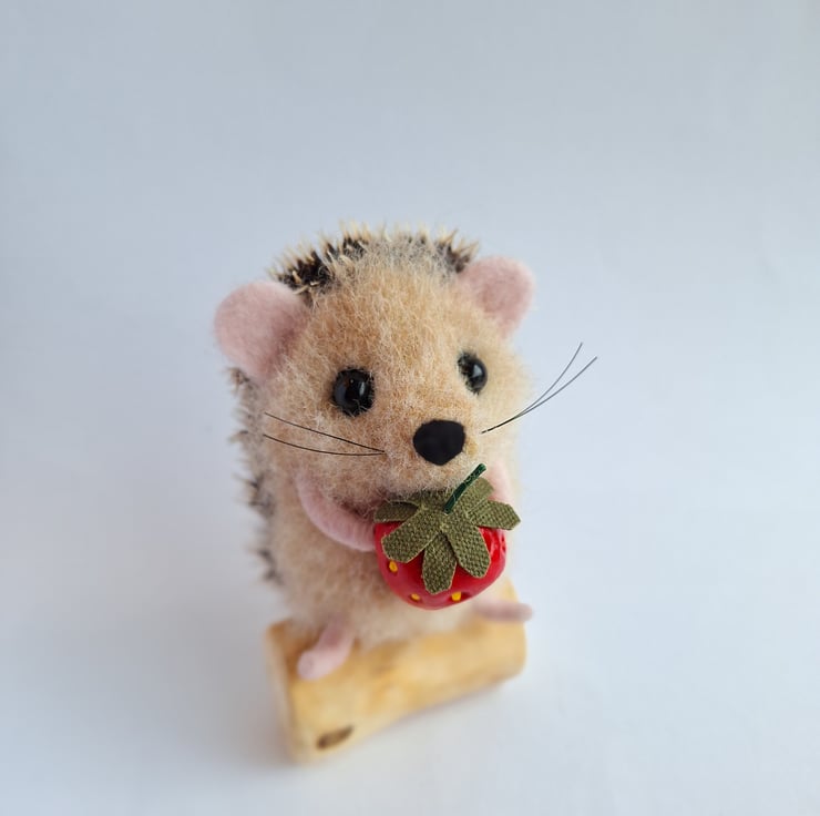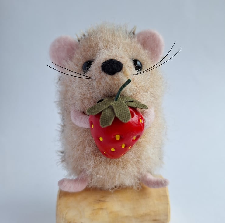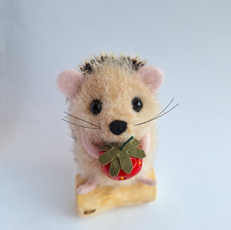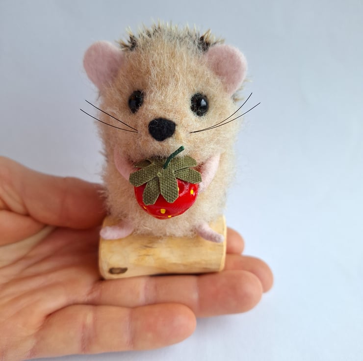A wee felted Hedgehog, made from soft carded wool and mohair fabric. This Hedgie is hollding a tiny hand crafted polymer clay Strawberry!