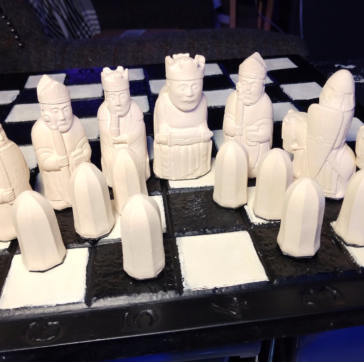 This Chess set is a copy of the original 12th century pieces discovered in the 1800s. The original pieces are currently on show in the British Museum.