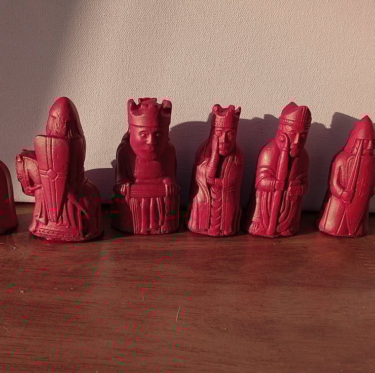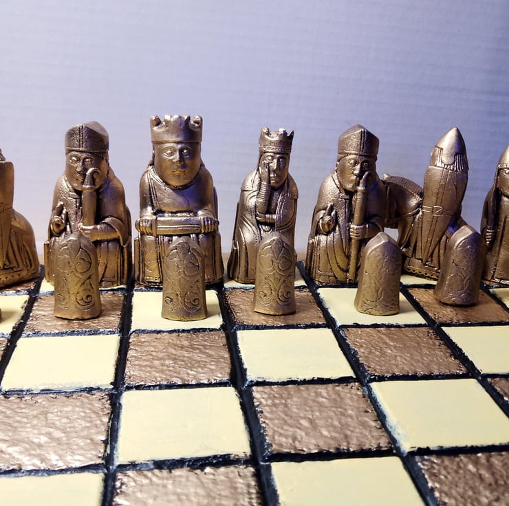 The history behind this the Lewis set is quite fascinating, The pieces belong to the Scandinavian world, which at this time the Hebrides were part of. Around the time the hoard of chess pieces was buried, Lewis belonged to the kingdom of Norway and the culture was a mix of Gaelic and Scandinavian. They were originally carved from Walrus Ivory and were discovered in a sandbank in 1831.