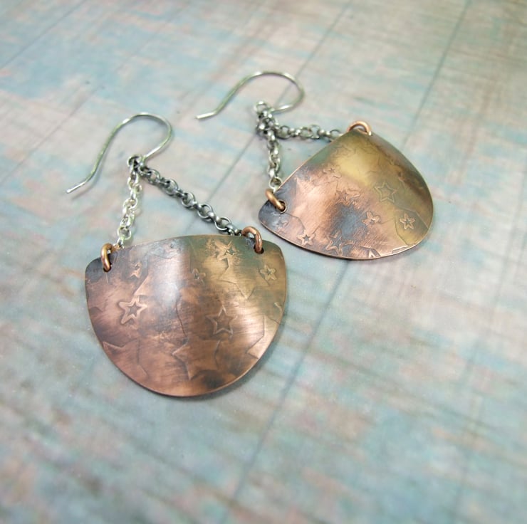 I have created the half circle shapes from copper sheet, hand cut and embossed with a stars pattern, using my own impression plate. I then slightly domed the shapes and then added some silver rolo chain and ear hooks. The earrings have been given an oxidised finish and polished.