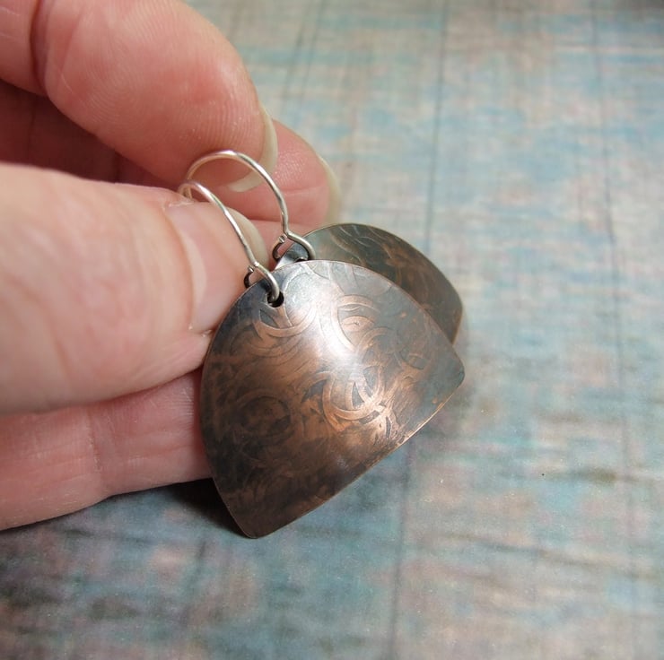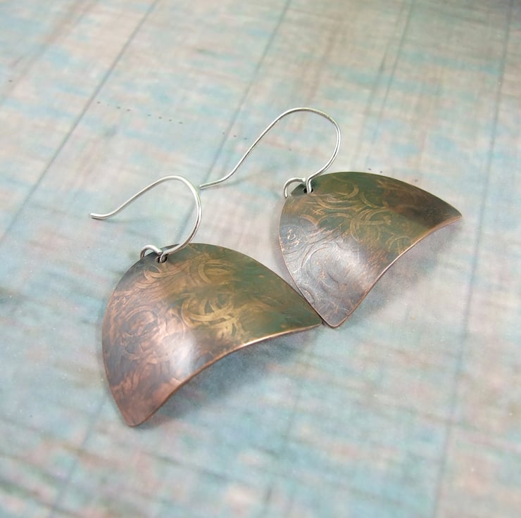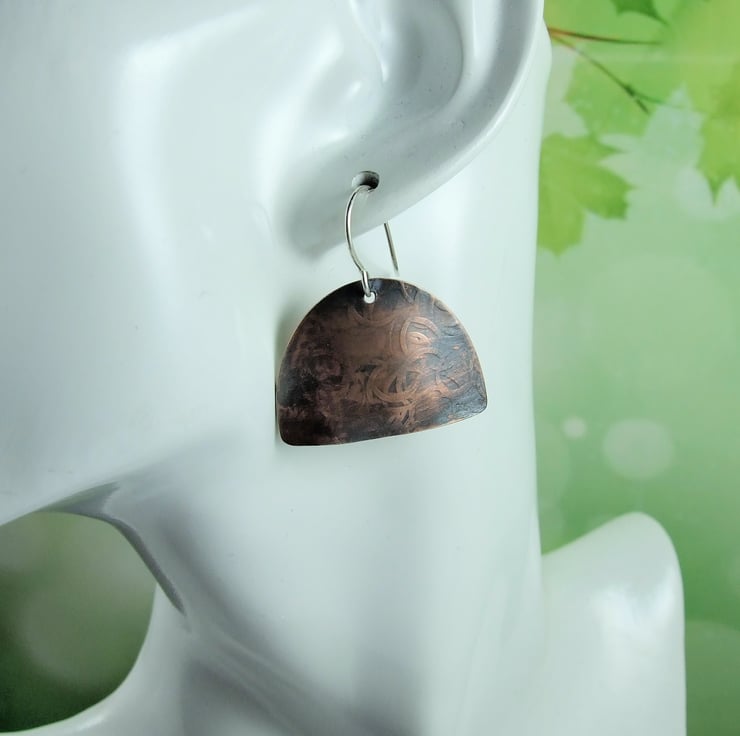 I have created the half circle shapes from copper sheet, hand cut and embossed with a circles pattern, using my own impression plate. I then slightly domed the shapes and then added some sterling silver ear hooks. The earrings have been given an oxidised finish and polished.