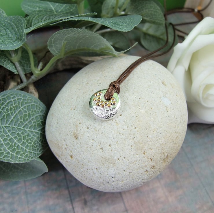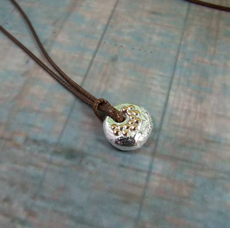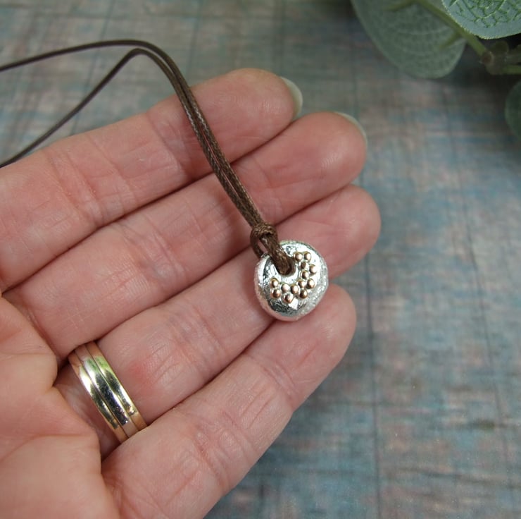 I have created the silver nugget from recycled silver heated to melting point when it forms a natural pebble shape, then once cooled slightly flattened on the top and drilled a large hole for the cord. I have added some copper beads for contrast and texture. Fitted to waxed cord with a sliding silver clasp, can be worn at any length to 28 inches.