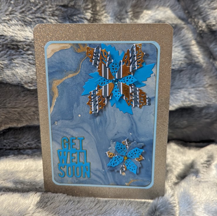 Atop is two beautiful flowers in contrasting blue/gold/white paper with a sticky gem centre and a die cut 'GET WELL SOON' in blue rimmed with gold.