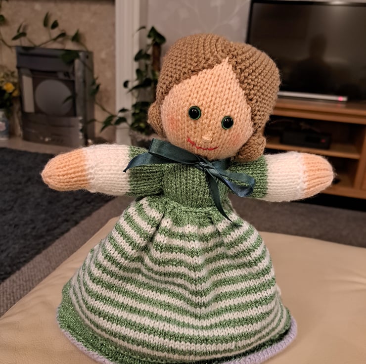 I love knitting and enjoy a challenge - this one was to knit a topsey turvy doll with a more modern style! I tried to incorporate colour from Elsa (Frozen) and other popular colours. I combined a Jean Howe pattern with a vintage womans weekly pattern. (Therefore I did not design it) This is really two dolls in one to play with!