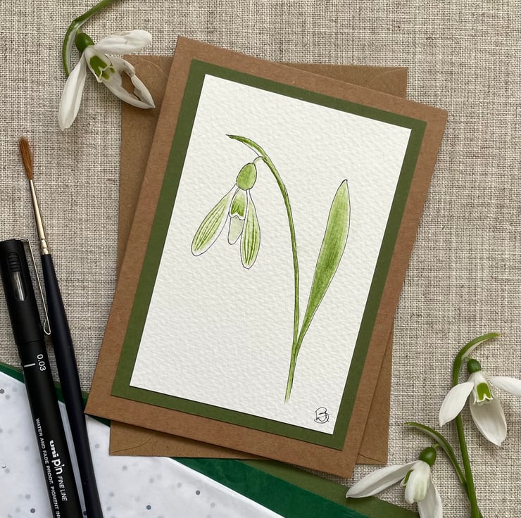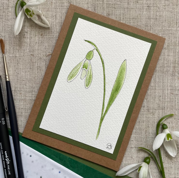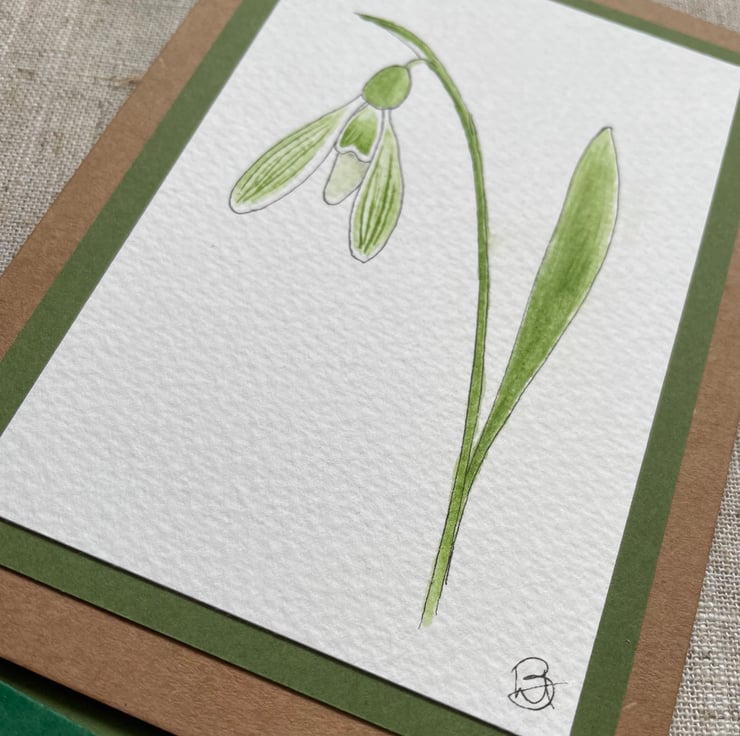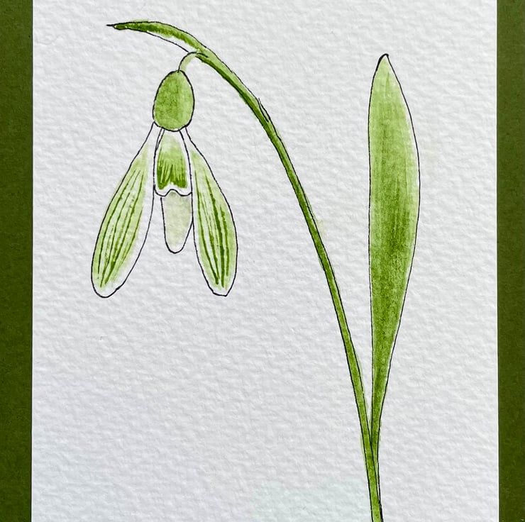 This blank greeting card features a single delicate snowdrop, this particular variety is 'Arwen 008' a delicate snowdrop with a hint of green on it's outer petals, hand painted in watercolour and outlined in ink, then mounted onto a complementary olive green background border, it has been left blank for any occasion and would make a lovely card for a January birthday, a snowdrop collector, or just sending a pretty note to a friend but could also be framed and put up on a wall.