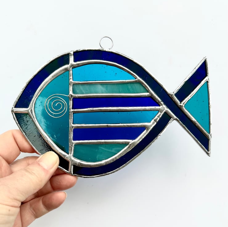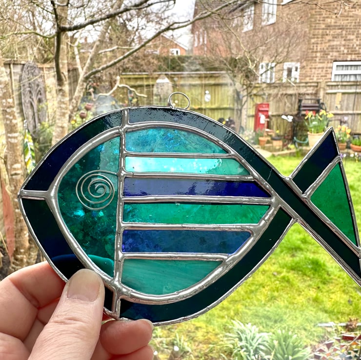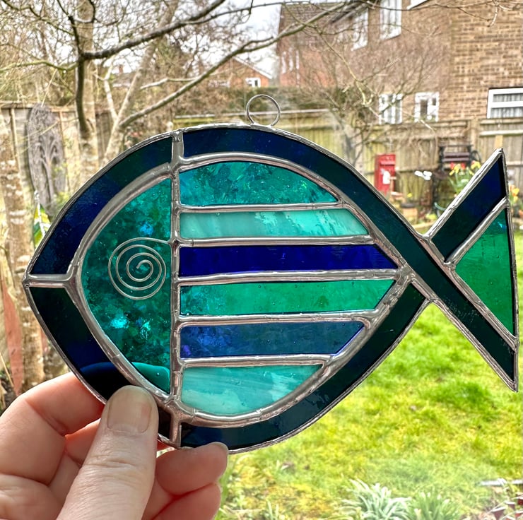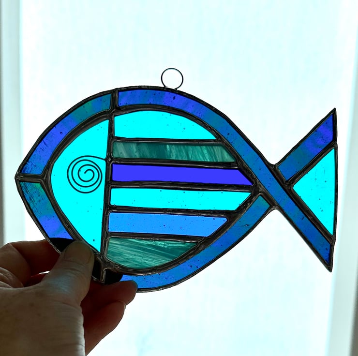 Stained Glass Striped Fish Suncatcher - Window Decoration - Blue and Turquoise
