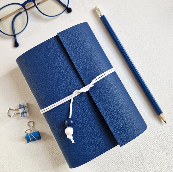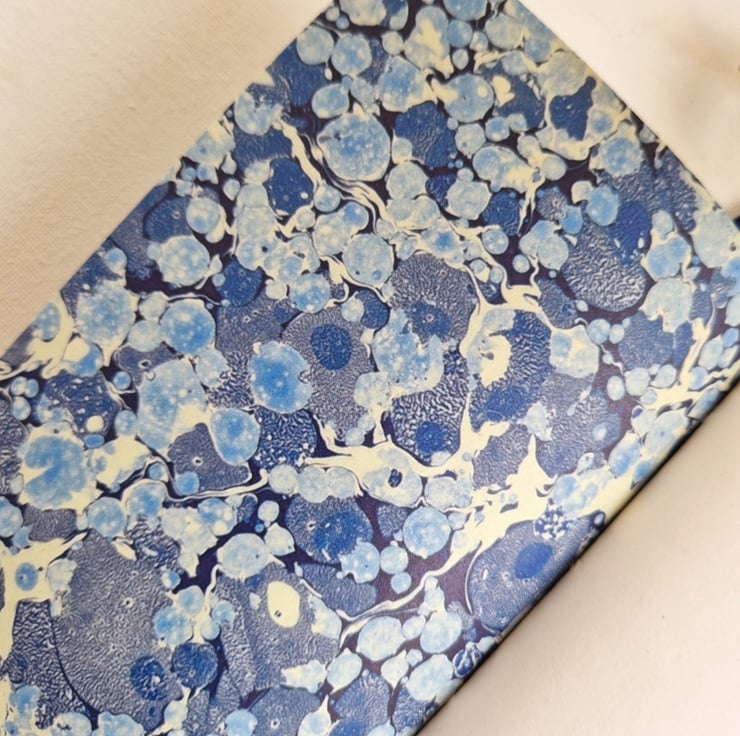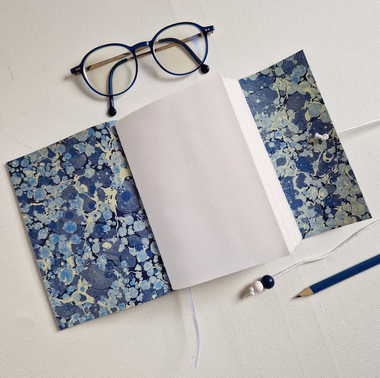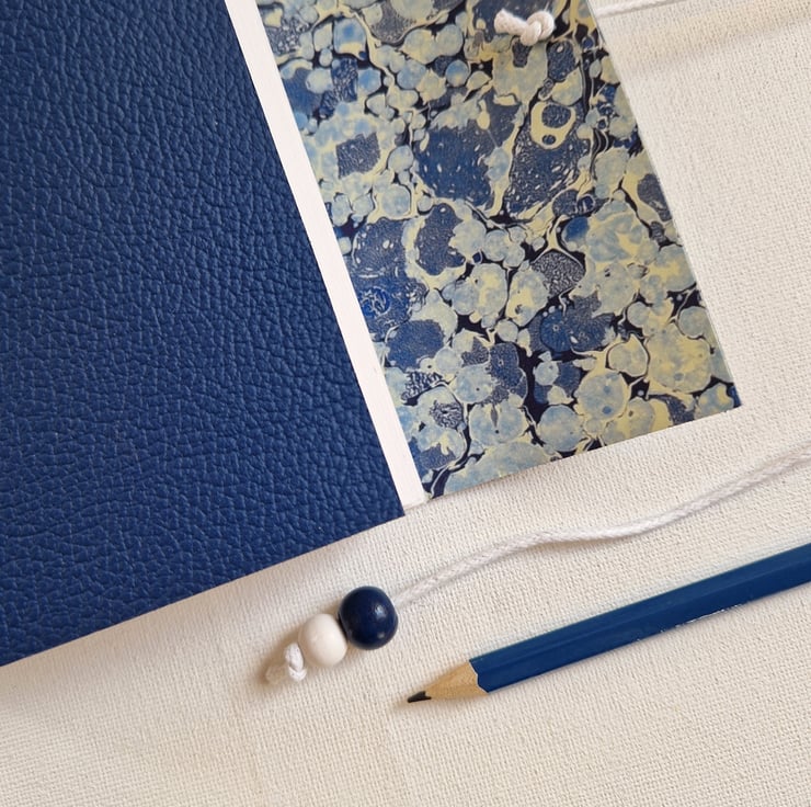 A beautiful Denim Blue Leather Journal or Notebook, Sketchbook. The covers are lined with a stunning Marble Paper and the Journal is closed with a white Cotton Cord and finished with two wooden beads.