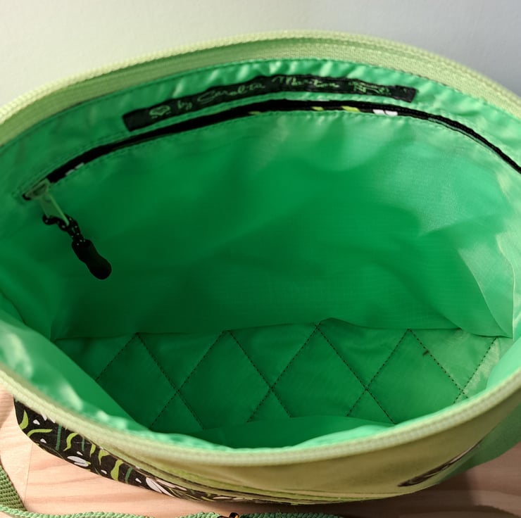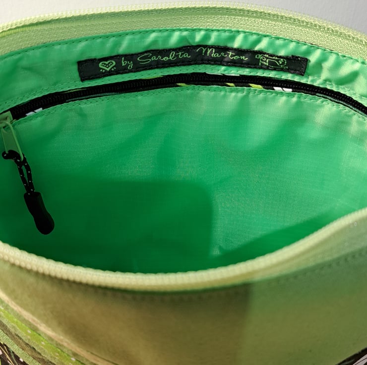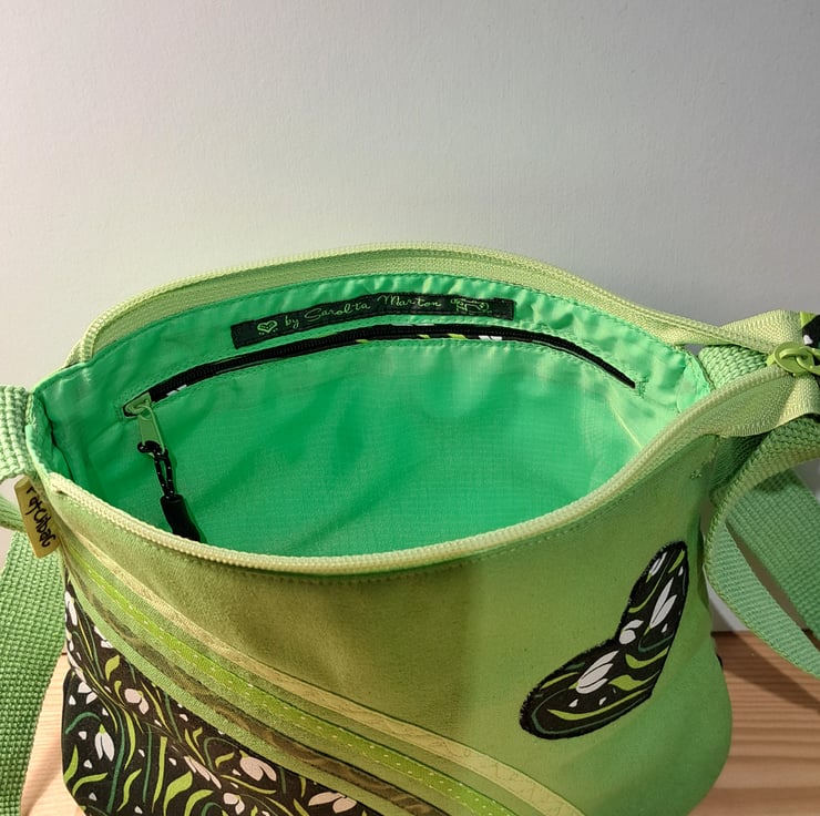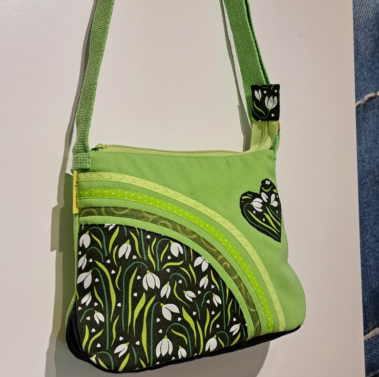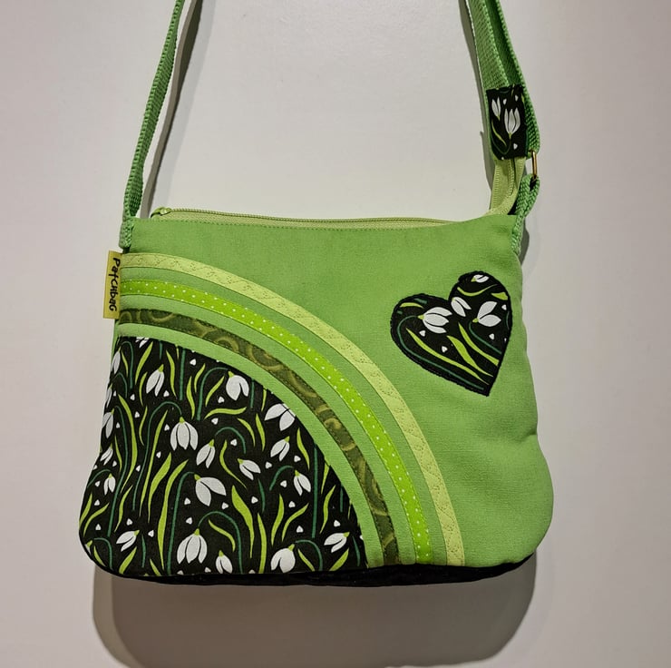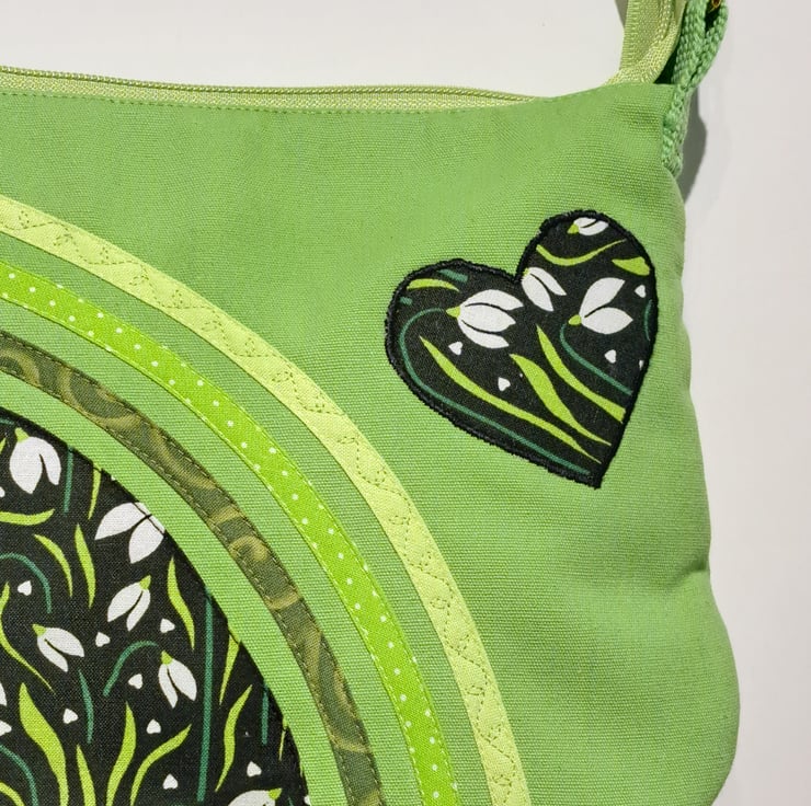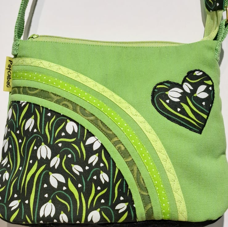Unique handcrafted patchwork and quilted handbag with snowdrops pattern. The small lightweight canvas shoulder bag decorated with applique heart with snowdrops . The main colors are different shades of green, white and black. The lining of the bag made from waterproof fabric, has inner pocket with zip closure. The shoulder strap is adjustable. The handbag closing with zip on the top. This is a small size handbag, the dimensions are the followings: hight 20cm, width 27cm, depth 8.5 cm on the bottom of the bag.