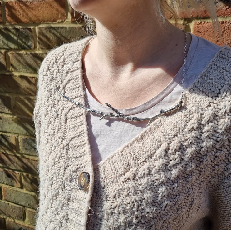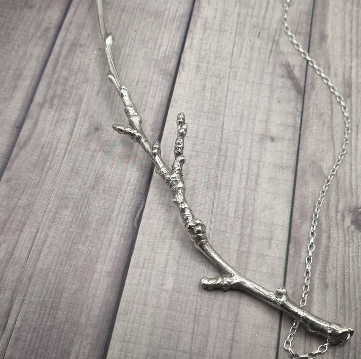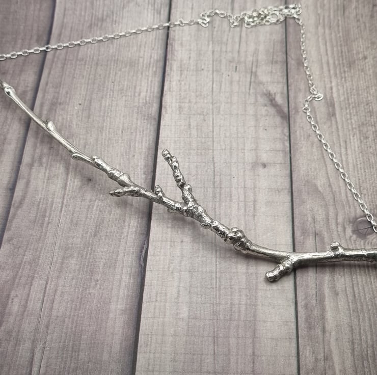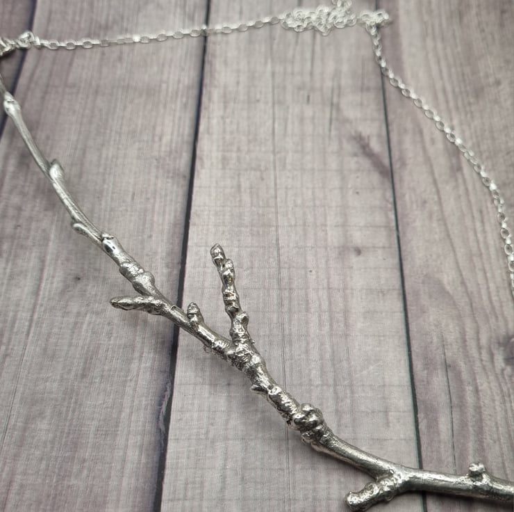 This beautiful piece of birch twig measures approximately 23cm across and is supplied on a sterling silver necklace chain, the length can be adjusted by attaching tye clasp to different links on the chain. It is a beautifully simple yet stunning and elegant statement necklace, a true one of a kind.
