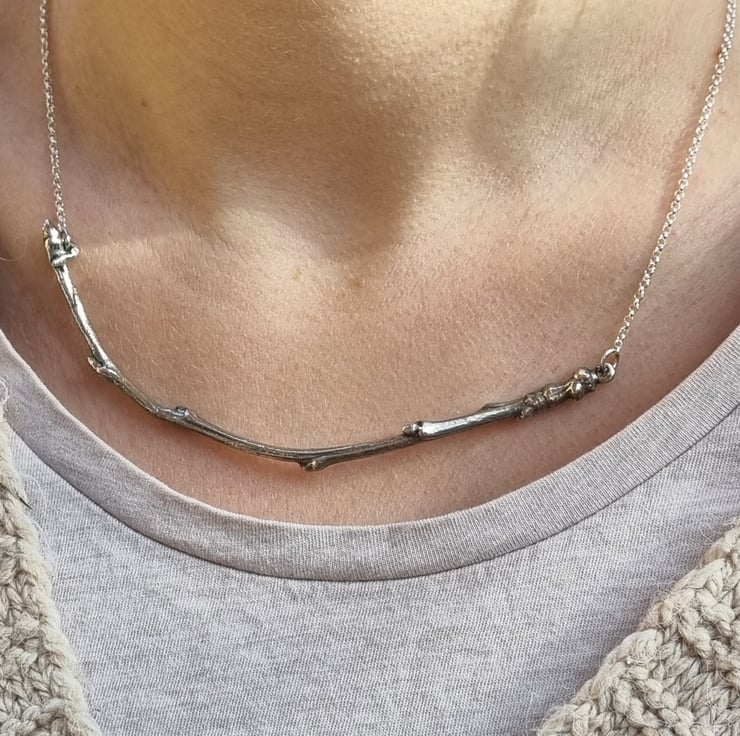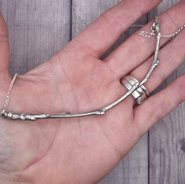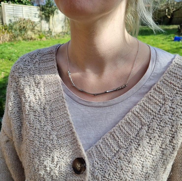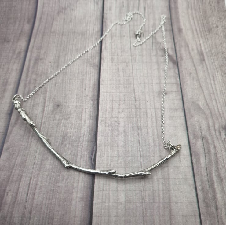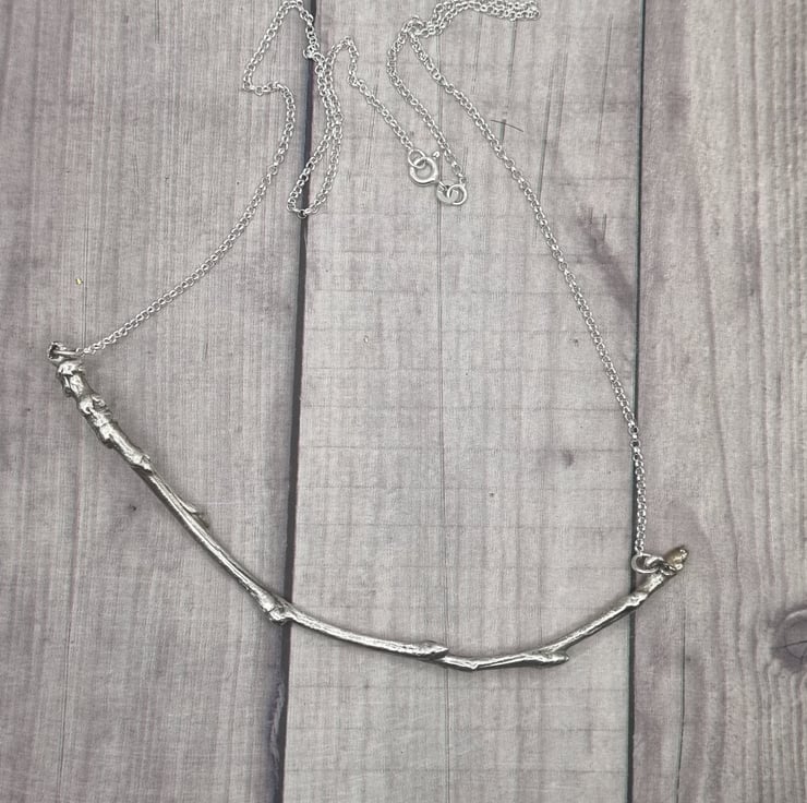 This beautiful piece of birch twig measures approximately 12cm across and is supplied on a sterling silver necklace chain, the length can be adjusted by attaching the clasp to different links on the chain. It is a simple yet beautiful unique item, a true one of a kind.