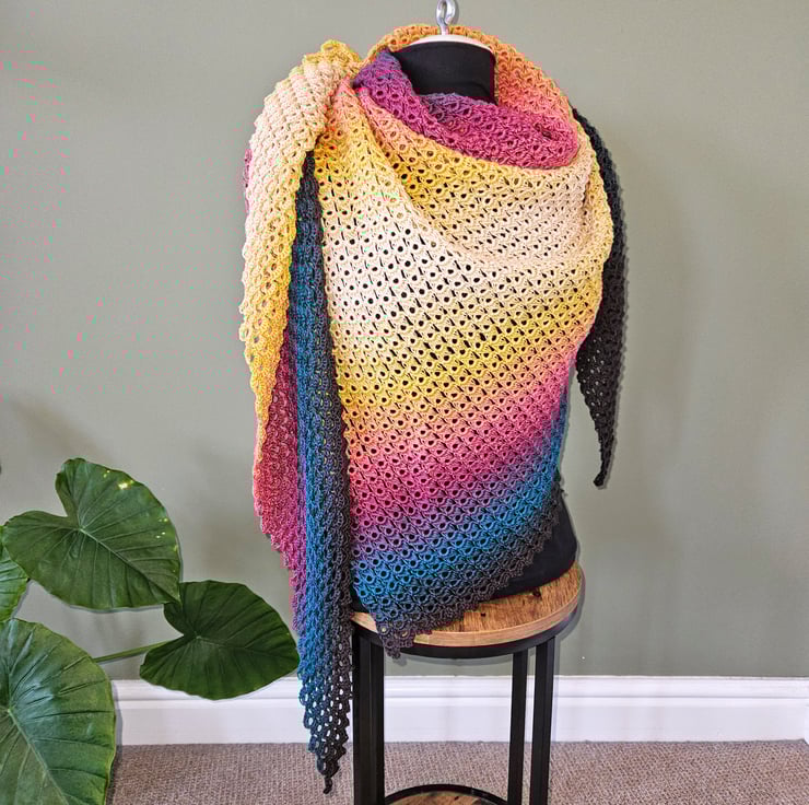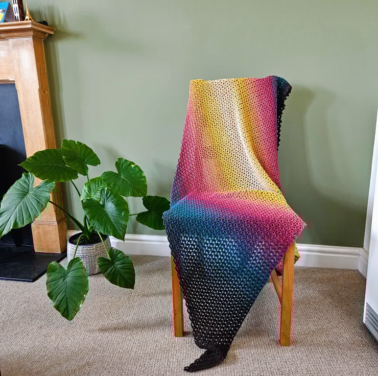 This is a double-sized shawl that I made using two Scheepjes Whirl yarn cakes. It weighs around 500g and would be most suitable for an adult. The pattern is my own creation using a broomstick stitch, which is my favourite.