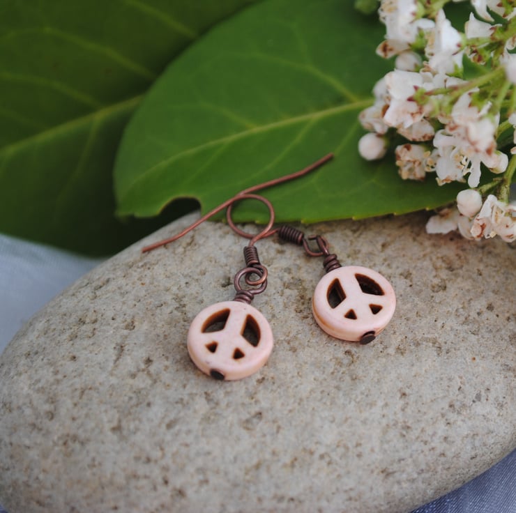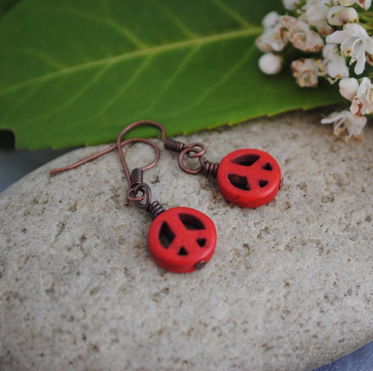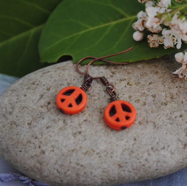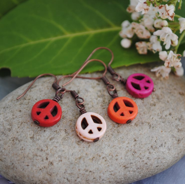 Howlite peace on antique copper earrings. Howlite is a semi-precious stone and these cross charms are dyed and are small sized at approximately 1 cm in length. The earrings are available in red, white (very pale pink, orange and fuchsia (pink).