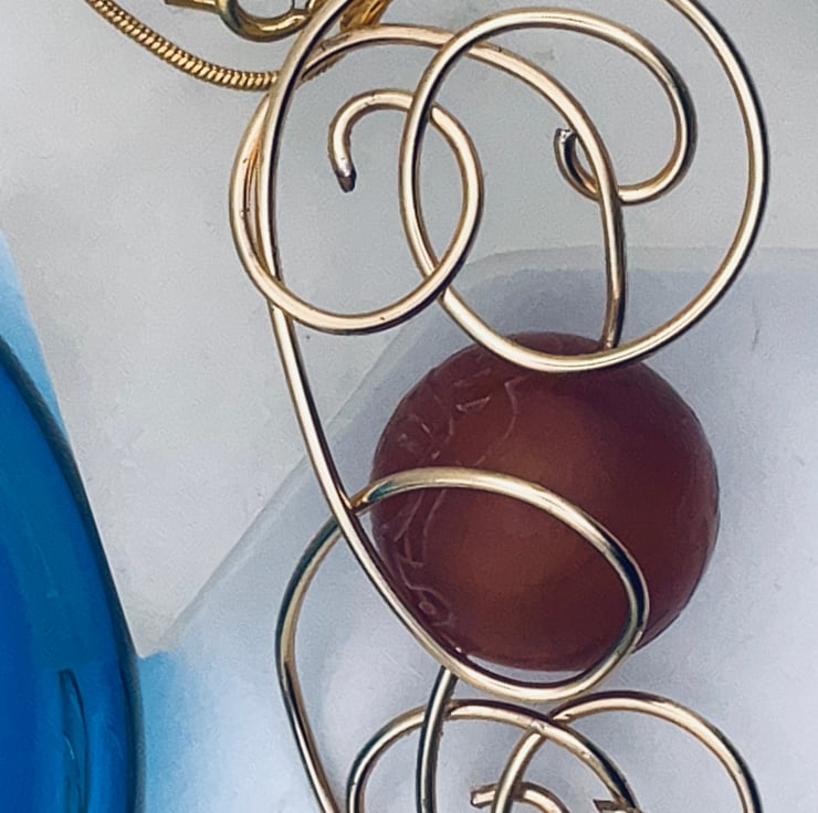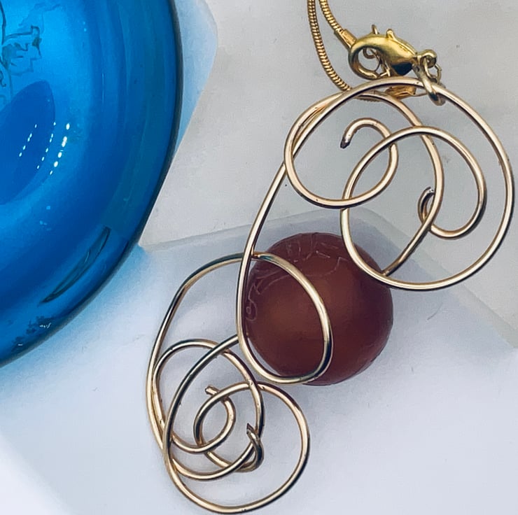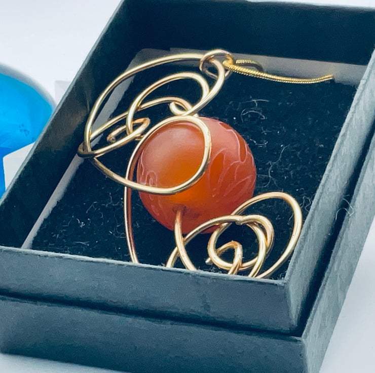 A spherical carnelian gemstone is held on golden coloured, interlocking, spiral wires. Carnelian is coloured by the presence of iron oxide. The blood red colour used to be thought to have a calming effect on the blood. Now more known for it;s autumnal shading. it can grace any ensemble in autumnal shades. Inexpensive wire is used to great effect. The sphere measures 20 mm in diameter and hangs on a gold coloured chain 500 mm long.