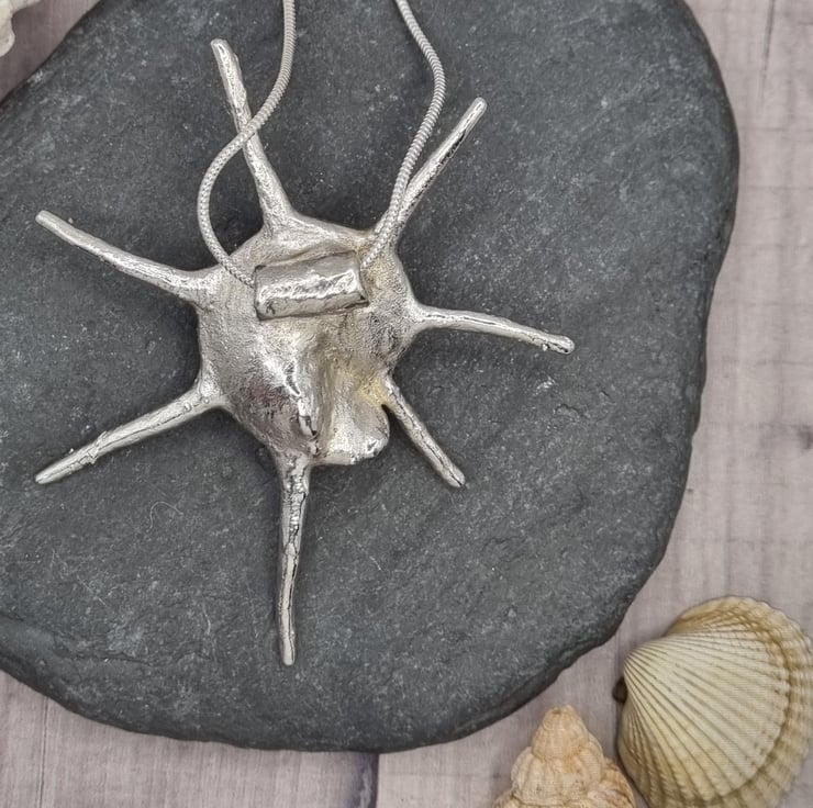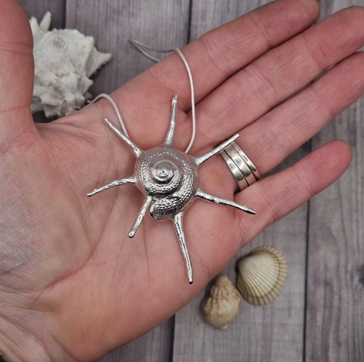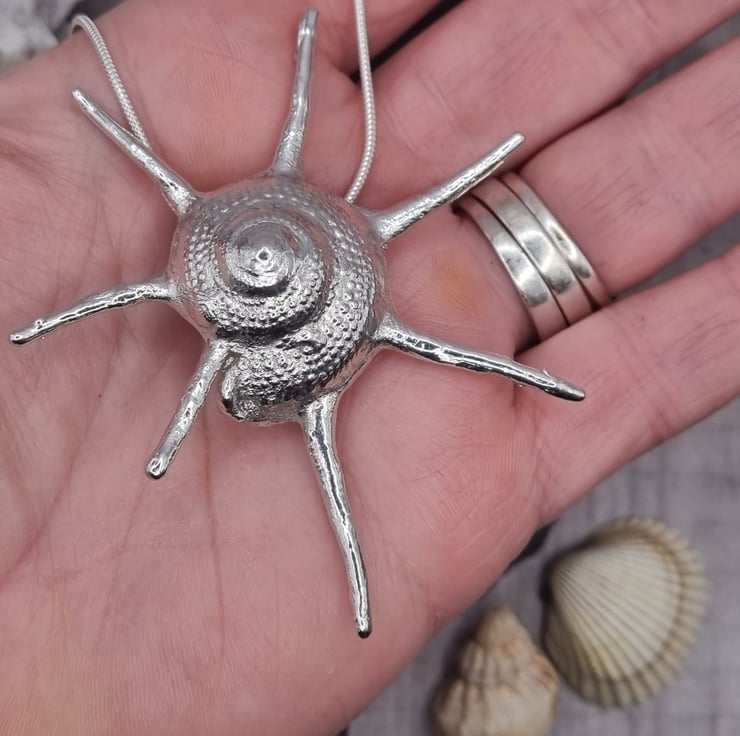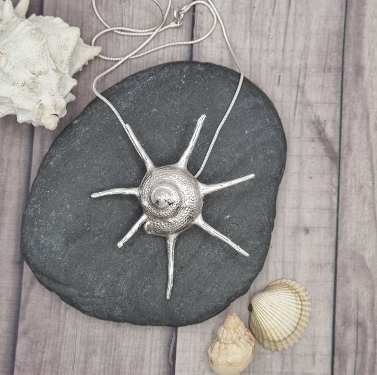 This necklace features as stunning Yoka star shell shell which measures approximately 6.5cm across from tip of point to tip of point and is supplied on an 20 inch sterling silver necklace chain. An.astinishingly beautiful piece of design work by nature, covered in silver to make a truly stunning statement necklace.