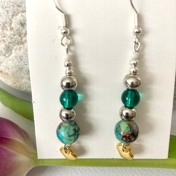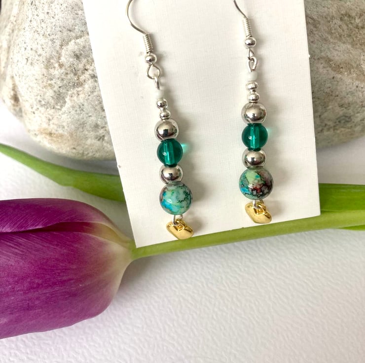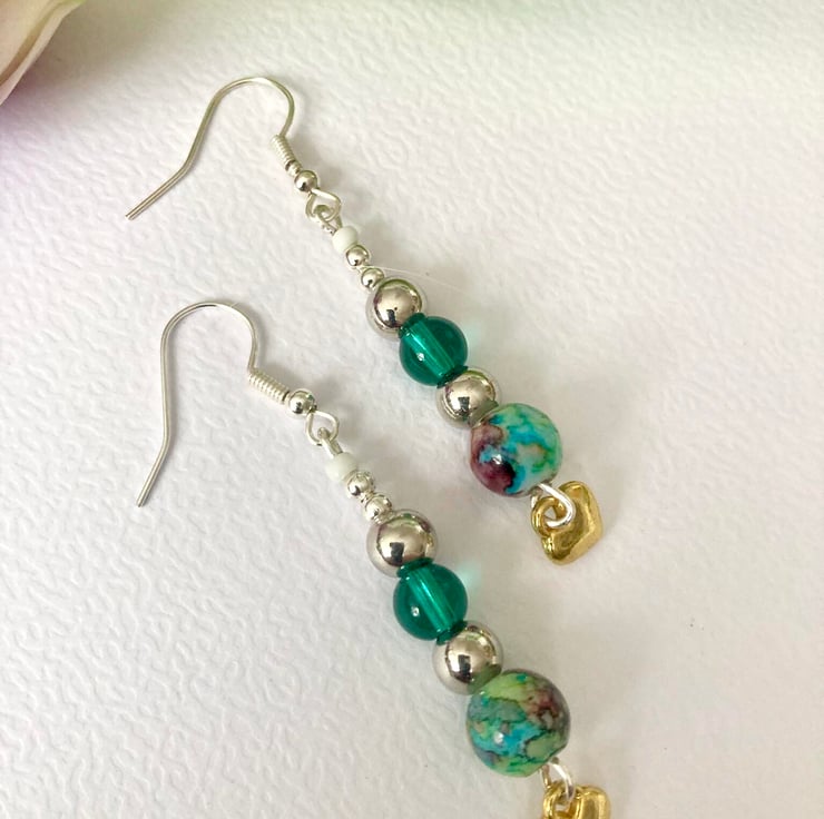 These beautiful earrings are made from super quality tarnish resistant Silver Plated jewellery wire featuring ocean and teal glass beads with a small gold puffed heart, boho style. Drop is approx 1.5. Hook ear wire.