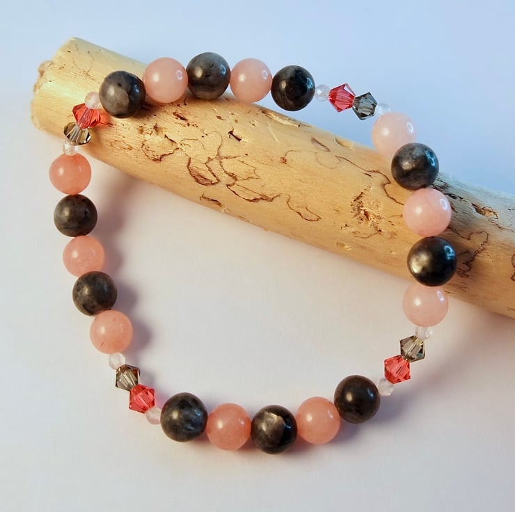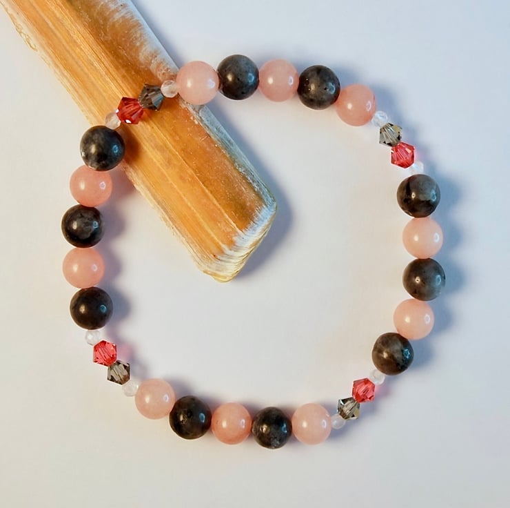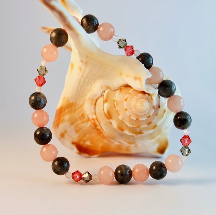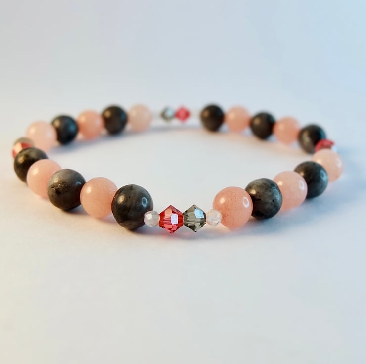 Stretch bracelet of alternating 6mm Pink Opal and Larvikite beads with pairs of sparkly, premium crystals in the colours 'padparadscha' and 'black diamond', which are set between tiny 2mm faceted Rose Quartz beads.