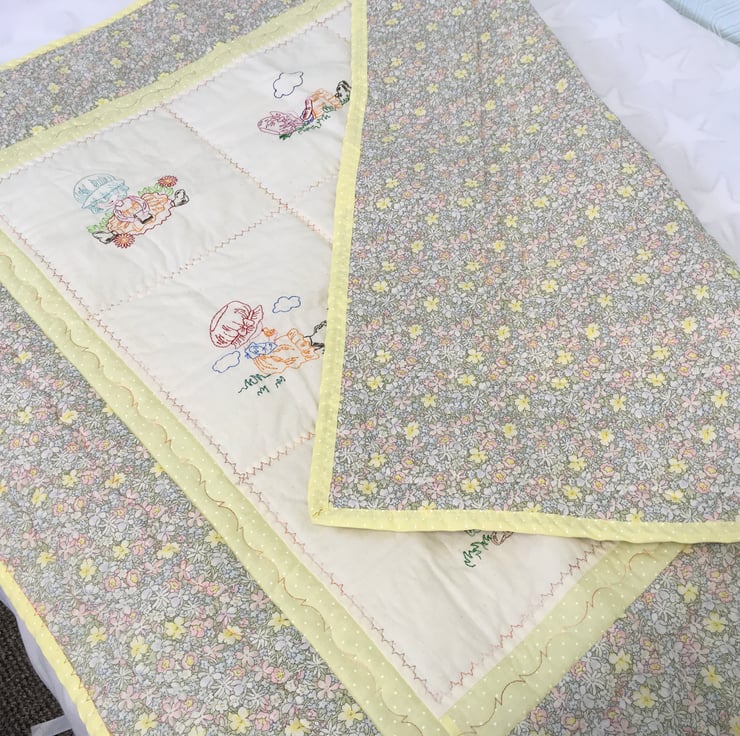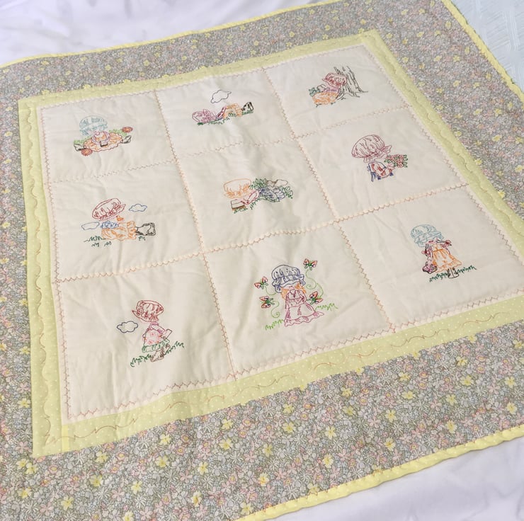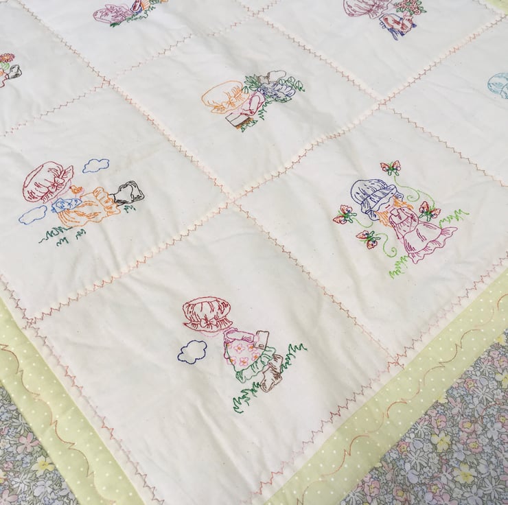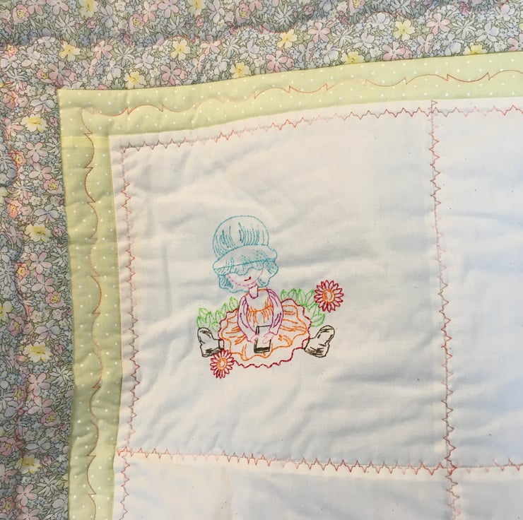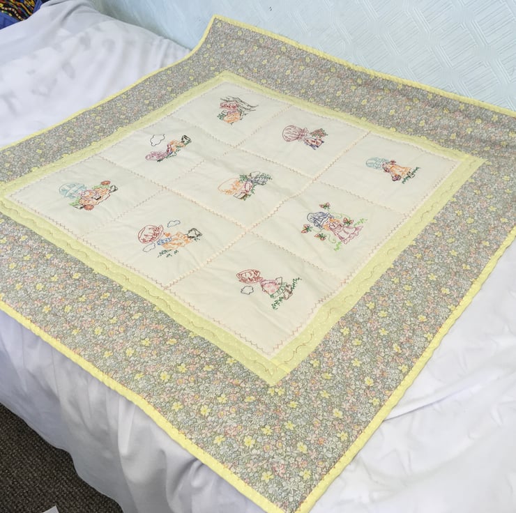 This summery looking quilt with designs of a girl in a big bonnet will give a youngster plenty to look at as it covers her bed or lays on the playroom floor. The quilt shows a girl enjoying a nice day in the country, reading a book, sitting and lying in the grass with flowers and butterflies around. It has a wide, floral border, a matching backing and is quilted with fancy stitching to add to the decoration. It measures 40 1/2” square ( 43 cms) and is machine-washable at thirty degrees.