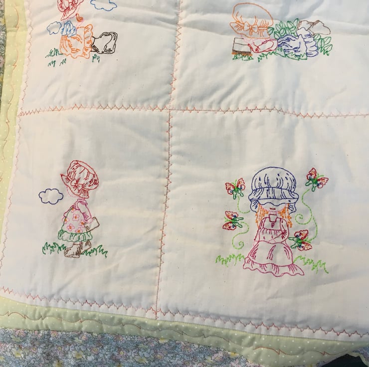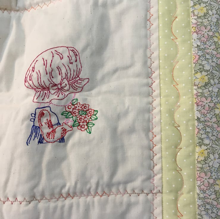Multi-coloured Designs of Girl in Big Bonnet. Quilt for Older Child. Travel Cot.