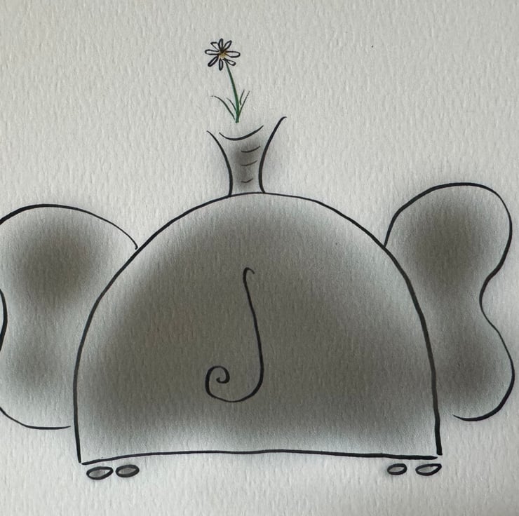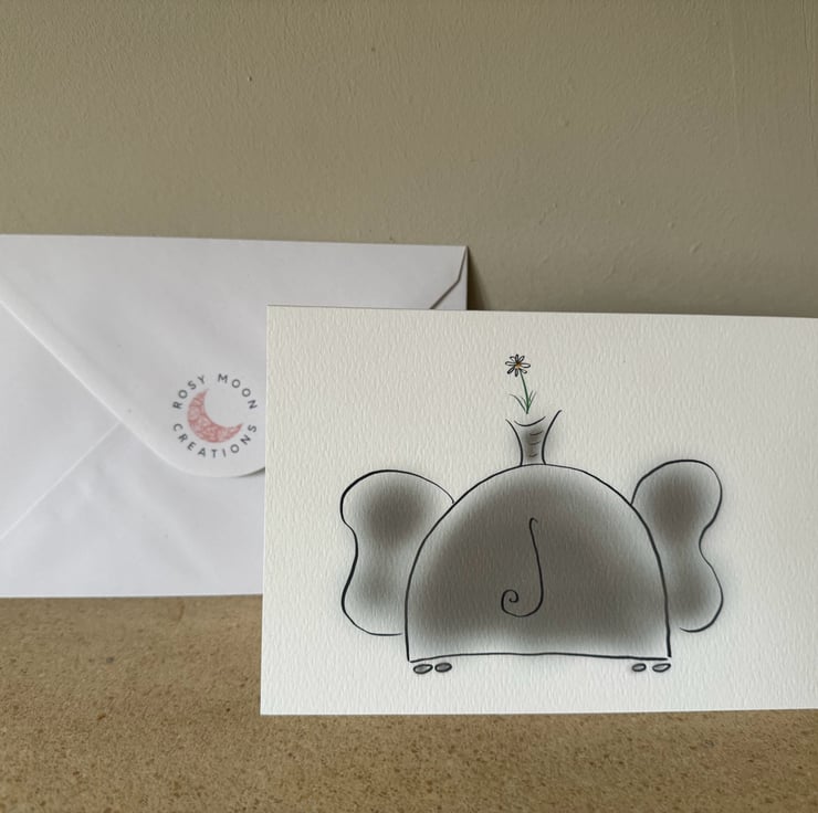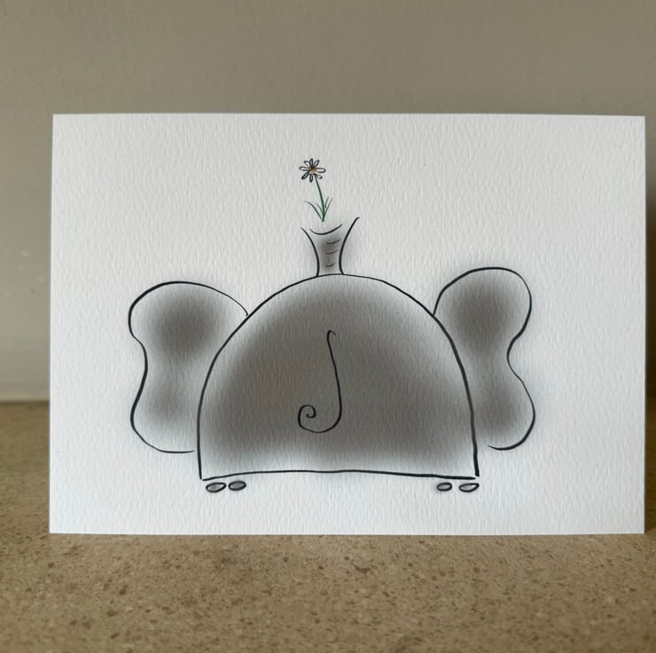 A lucky elephant birthday card holding a daisy, the birth flower for April.