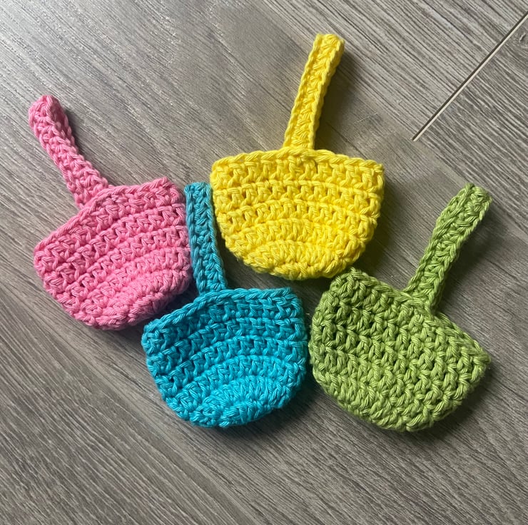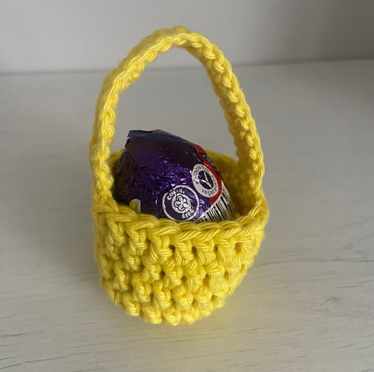 Set of 4 mini crochet Easter baskets in four different spring themed colours, just big enough to fit a creme egg in or even a few mini eggs. Ideal as Easter table favours or as a small gift!