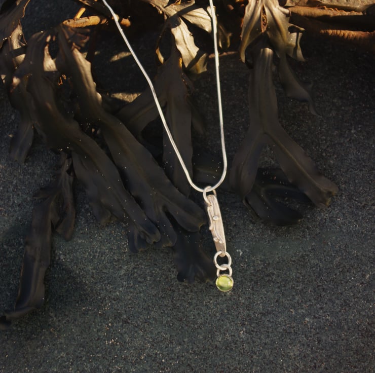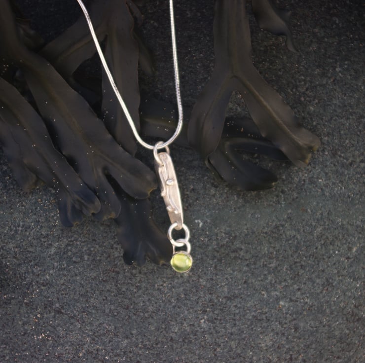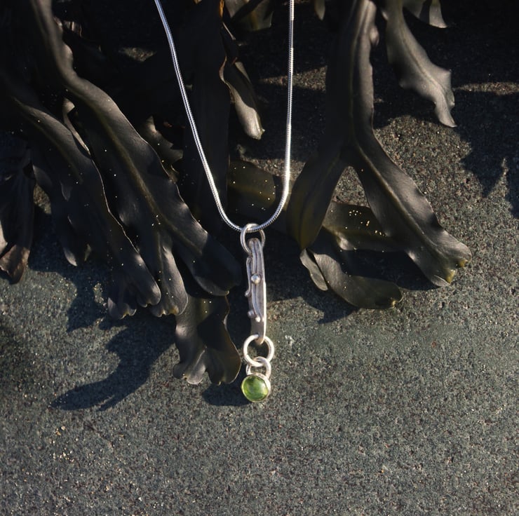 A fresh green Peridot handset in silver dangles from an oval sterling silver piece. This is decorated with a design, inspired by seaweed which I have soldered to the piece. The diameter of the Peridot is 6mm; the length of the pendant is 30mm/ nearly 1.25 inches.
