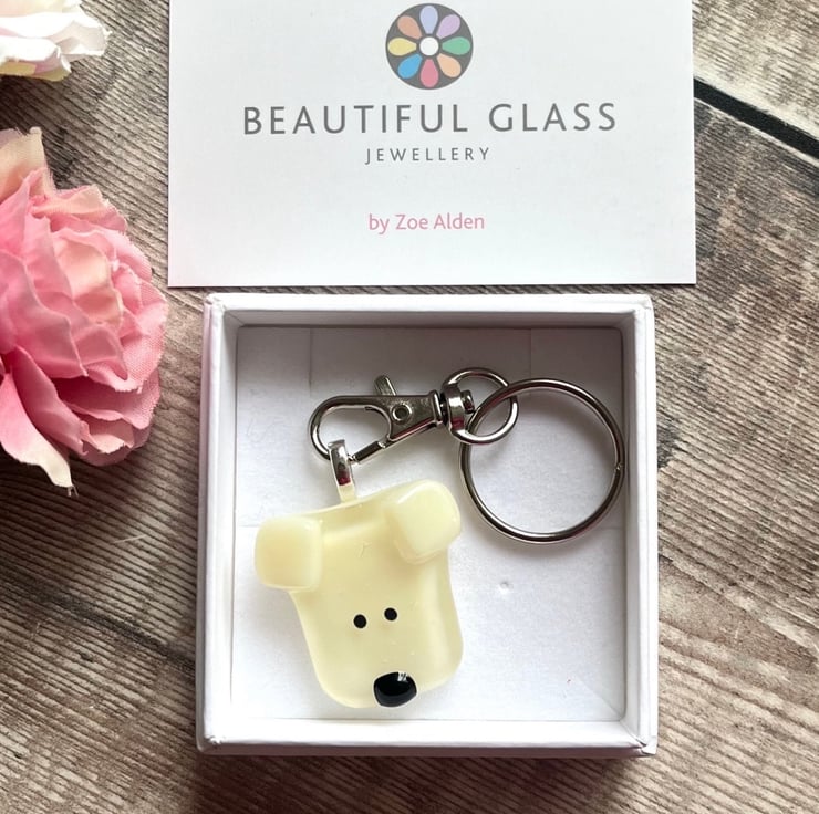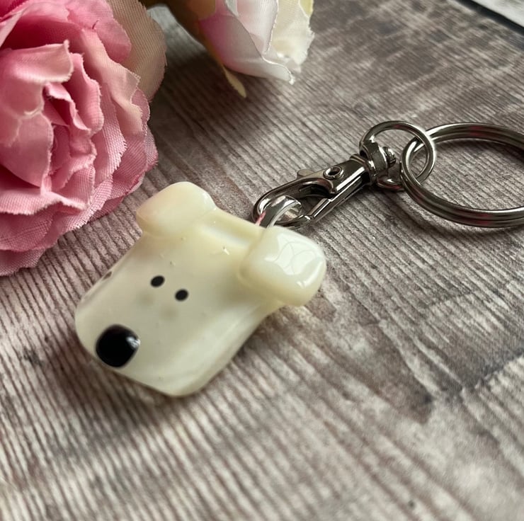 Made with pieces of white glass fused together at high temperatures, giving a lovely smooth finish. It measures approximately 2.5cm x 3cm and comes on a silver plated bail with a split ring and a keyring trigger.