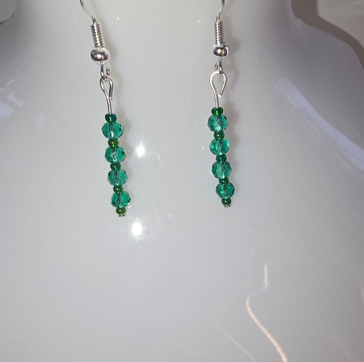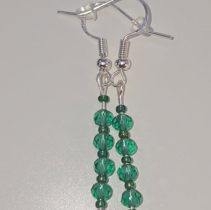 The earrings have been made using green faceted rondelles they are 4 high in total and have small dark green seed beads above and below each one.The hooks are silver 925 and they can be changed to clip-ons if required. Please just ask when ordering as they can can changed over for free.