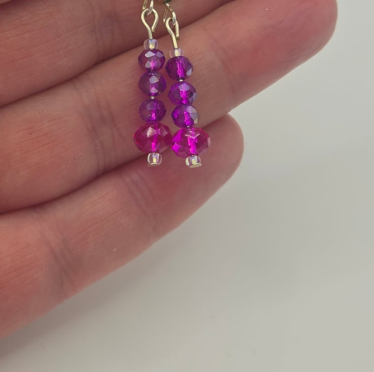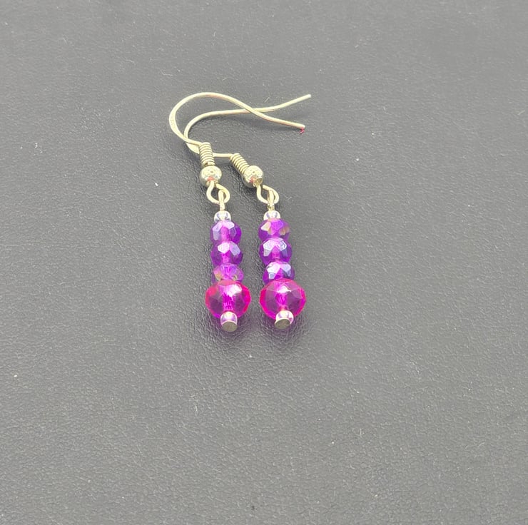 The earrings have been made using 3 small dark purple faceted rondelles and a larger dark pink faceted rondelle at the bottom of the earrings. Small crystals seed beads are at the top and bottom of the first and last faceted rondelle. The hooks can be changed to clip-ons, please select the correct option from the drop down menu.