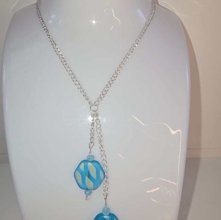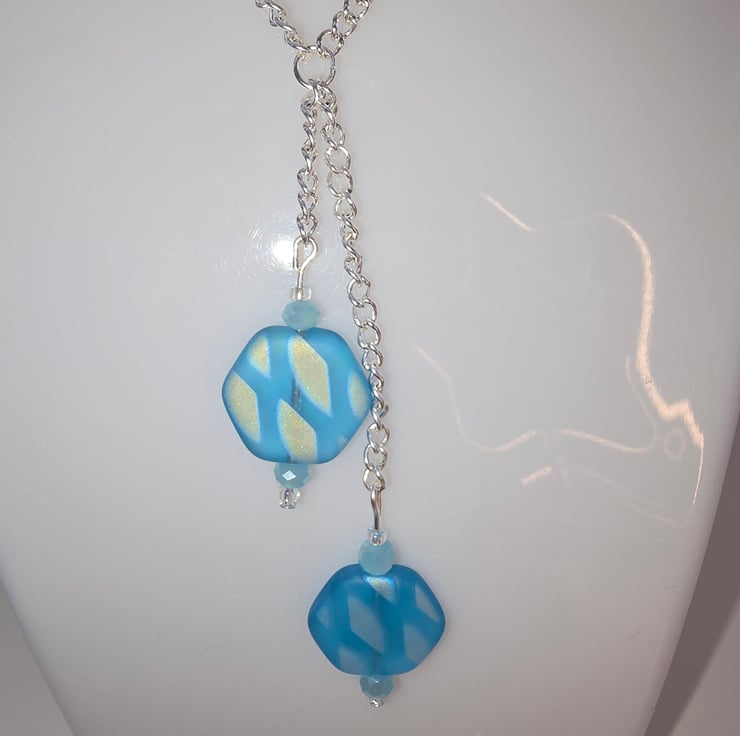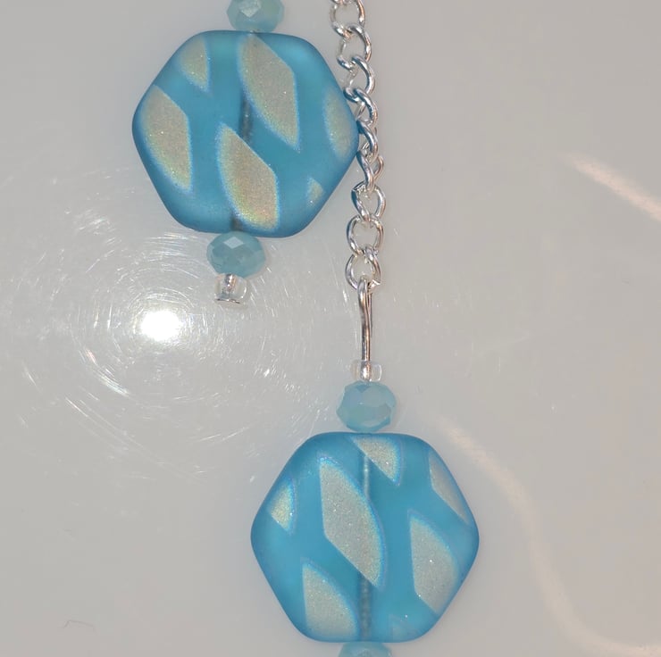 The necklace has been made using a silver chain. The chain is joined using a jump ring which has 2 chains coming down of different lengths. Attached to each part of the chain are blue shimmer matt hexagon 17mm pressed czech glass beads with small light blue faceted rondelles above and below them with small clear crystal seed beads one below the faceted rondelles and one above.