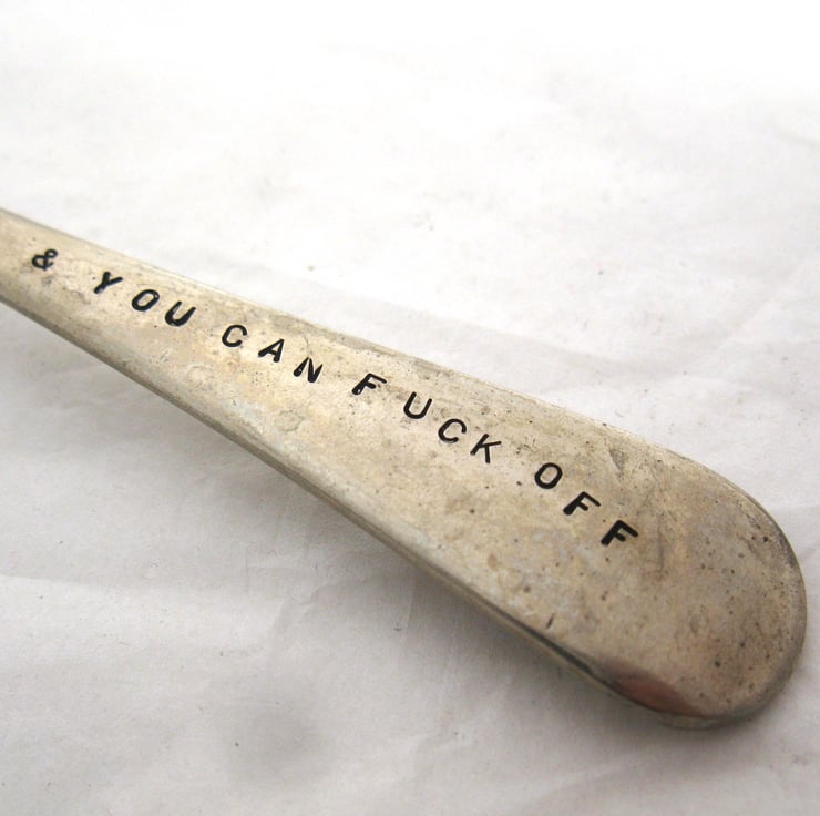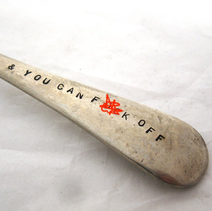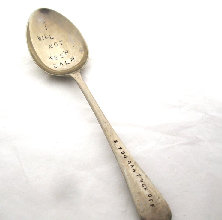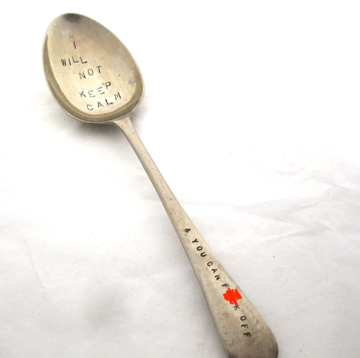A very rude handstamped 1940s vintage dessert spoon (approx. 18cm long). We are talking the F-word here: it says I WILL NOT KEEP CALM in nice clear 1940s vintage block lettering the bowl and then & YOU CAN F--K OFF on the handle in smaller but still very clear lettering. Not subtle, but to the point... the perfect gift for someone in the grip of menopausal rage, perhaps?