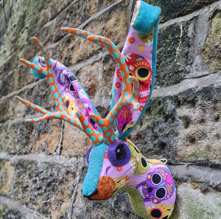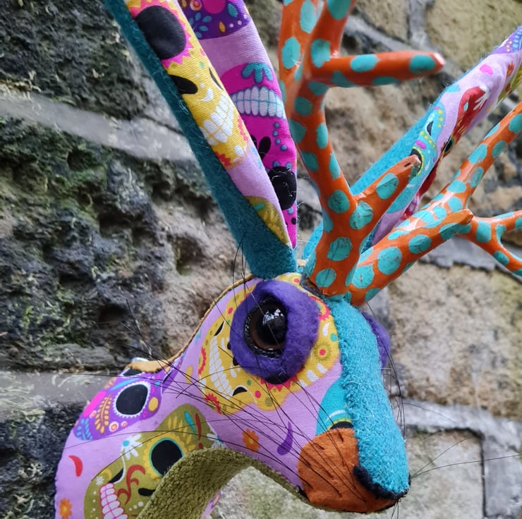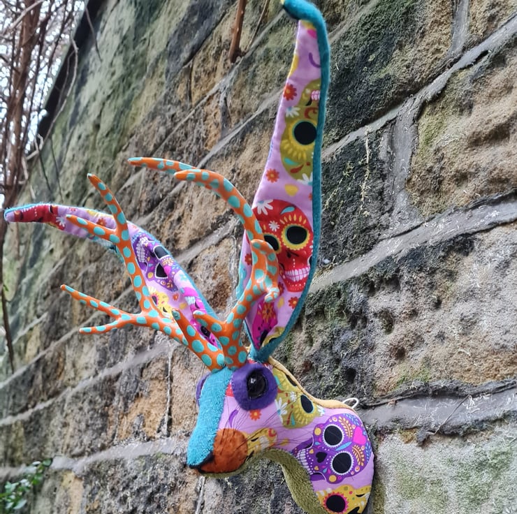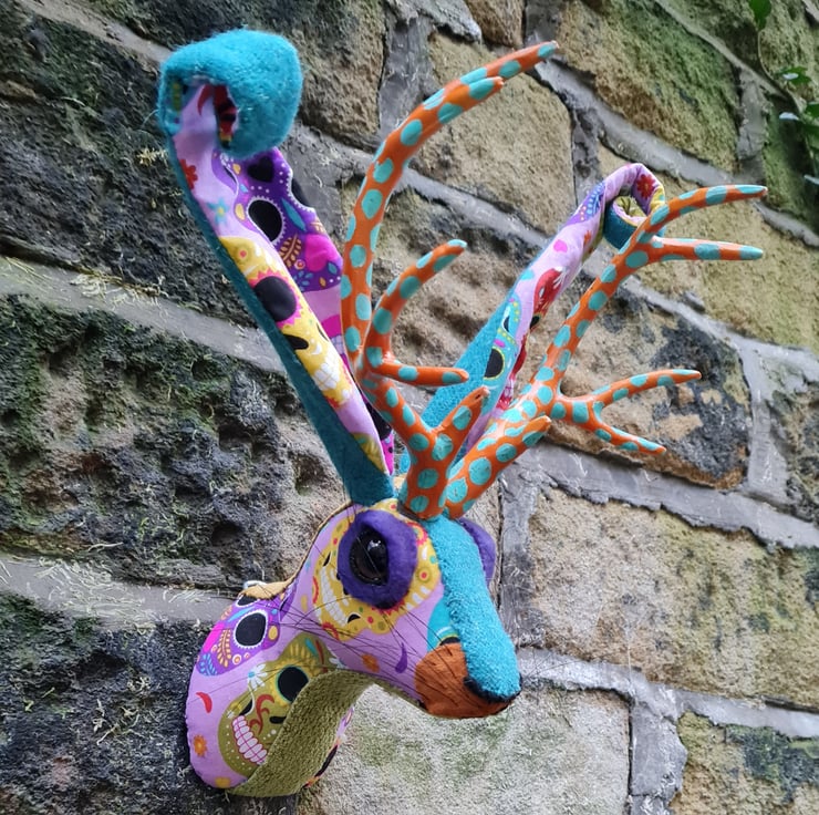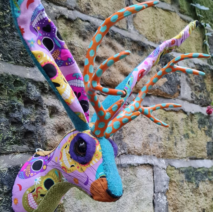 A lifesize faux jackalope (mythical hare with antlers) which I have handmade and covered in hand stitched Day of the dead skull fabric, upholstery fabric, velvet and tweed. The jackalope has hand painted antlers, giving a nod to the Mexican tradition of hand painted Alebrijes from Oaxaca.