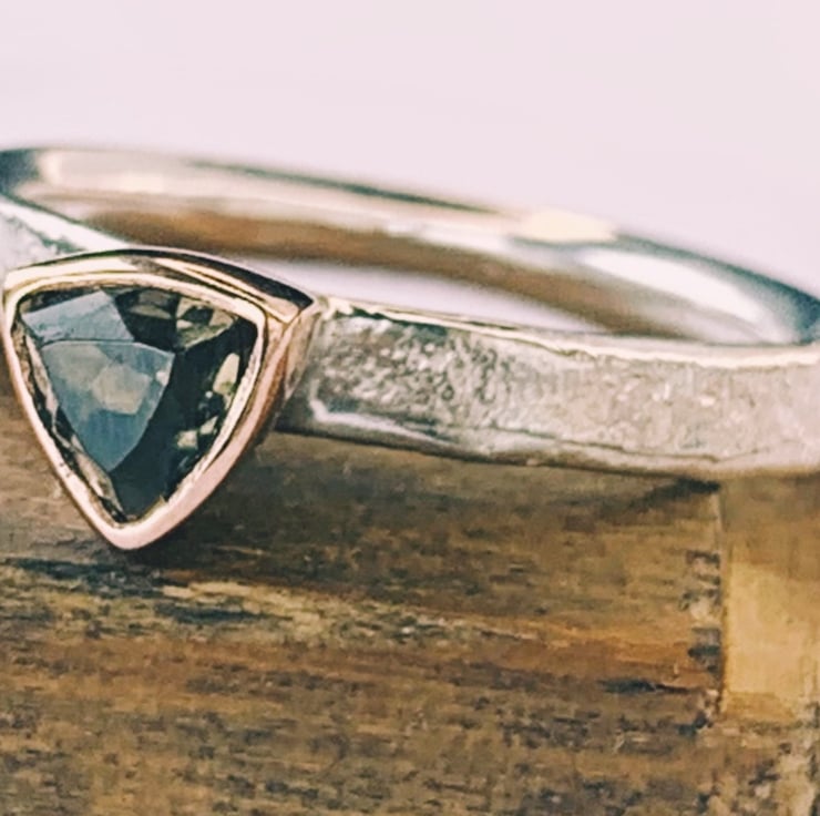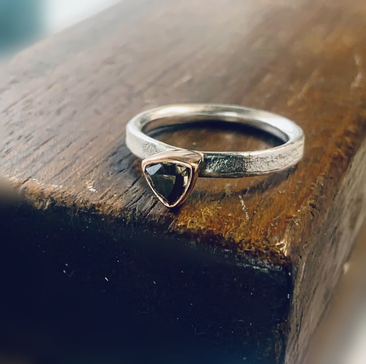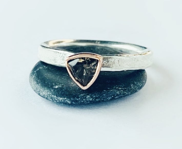 An unusual Trillion cut gem, the smokey quarts is dark with glints of amber and orange.