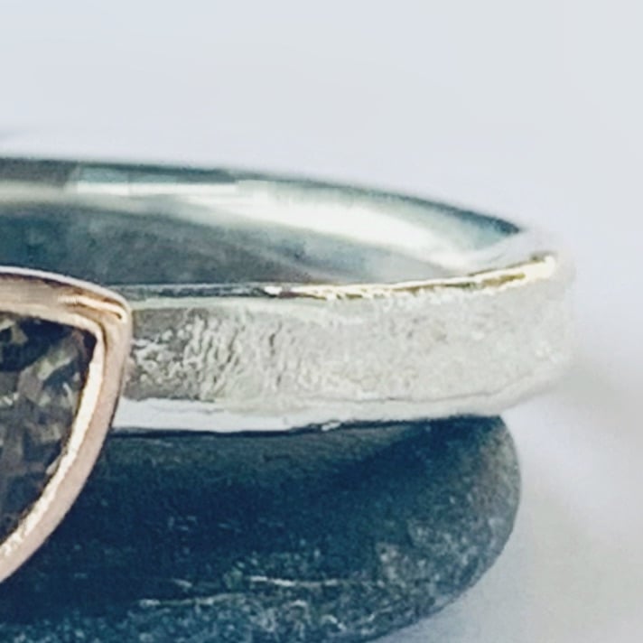 Handmade in my workshop a beautiful Smokey Quartz gem set into solid 9 carat rose gold embelisshing a textured Recycled Sterling Silver Ring.