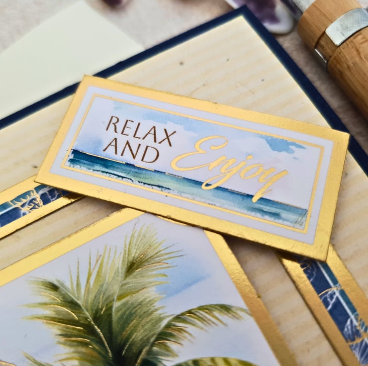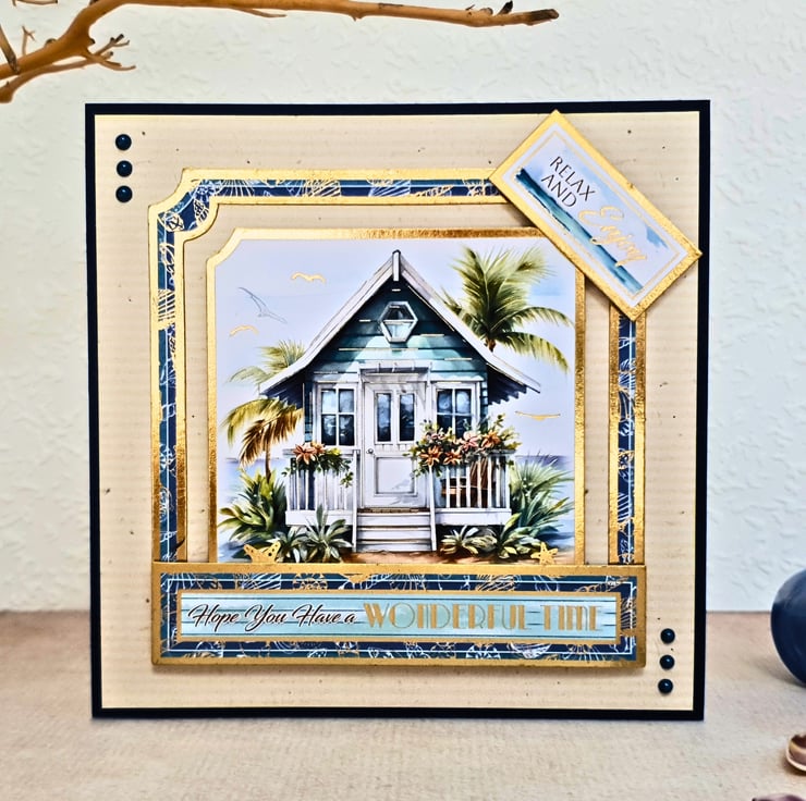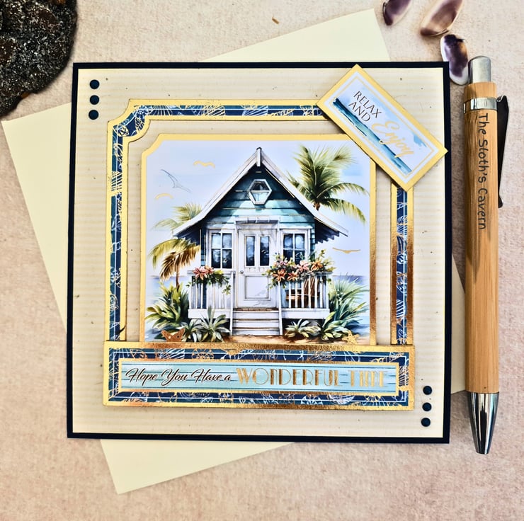 It consists of ivory card base layered with mats of Navy Blue card & ivory patterned cardstock. It is decorated with a square shaped, gold foiled topper that displays a beach house in front of the sea, & it is framed with a matching border. A small tag on the top right reads "Relax And Enjoy", while a bigger one at the bottom reads "Hope You Have A Wonderful Time". The card has been embellished with colour drops in metallic navy blue colour.