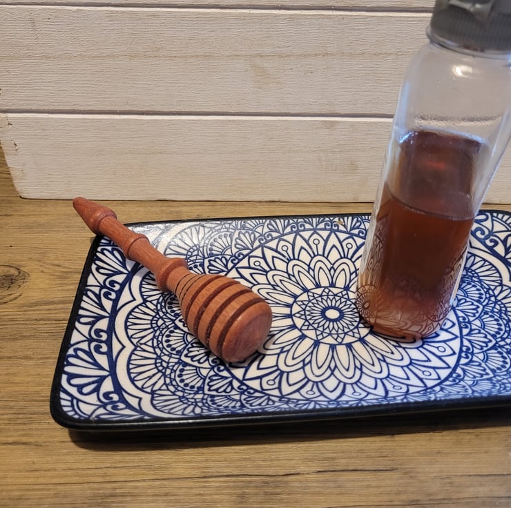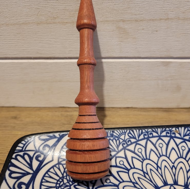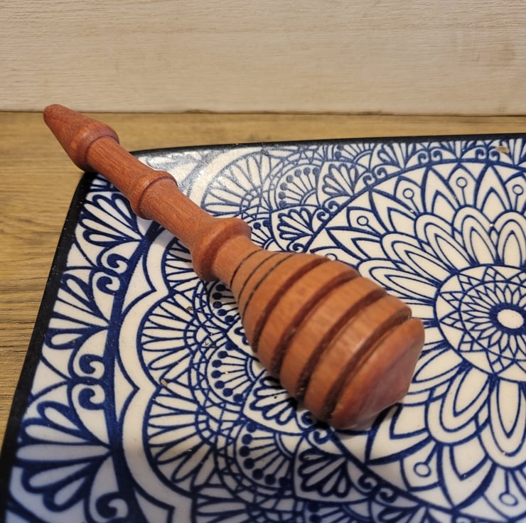 this is a nice cute little honey dipper made from african rosewood sometimes known as babinga.approx 13 cm long. it will be fab when pouring your honey and would make a lovly little gift. handmade here in Pembrokeshire