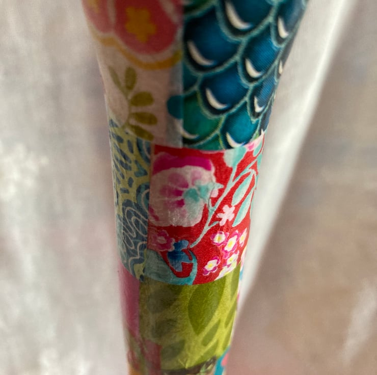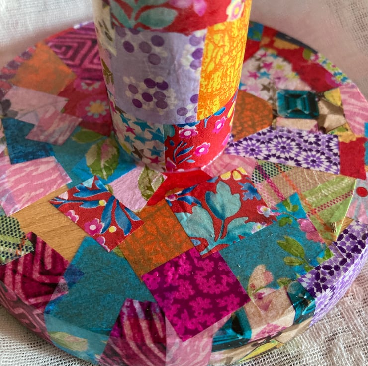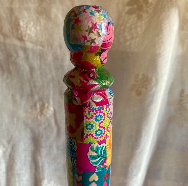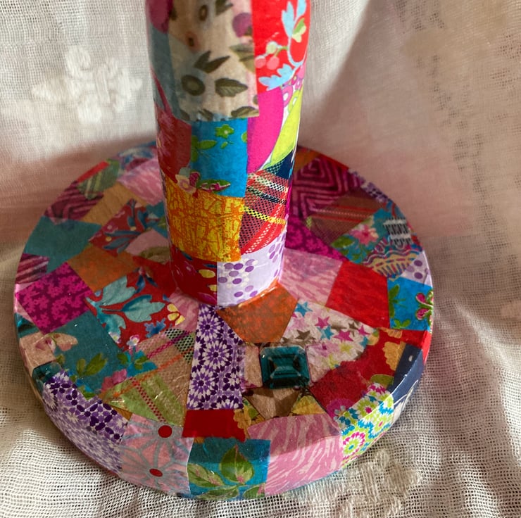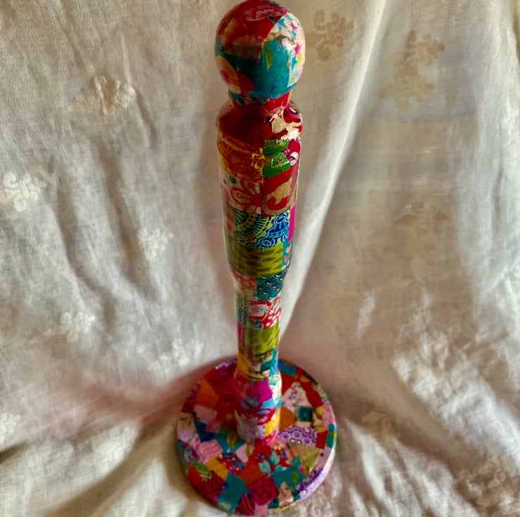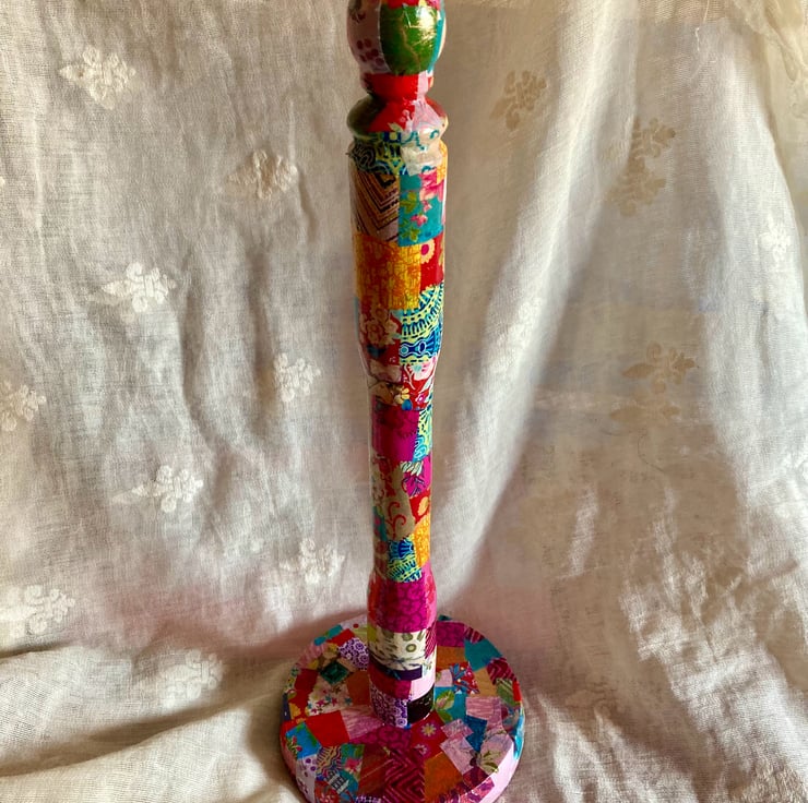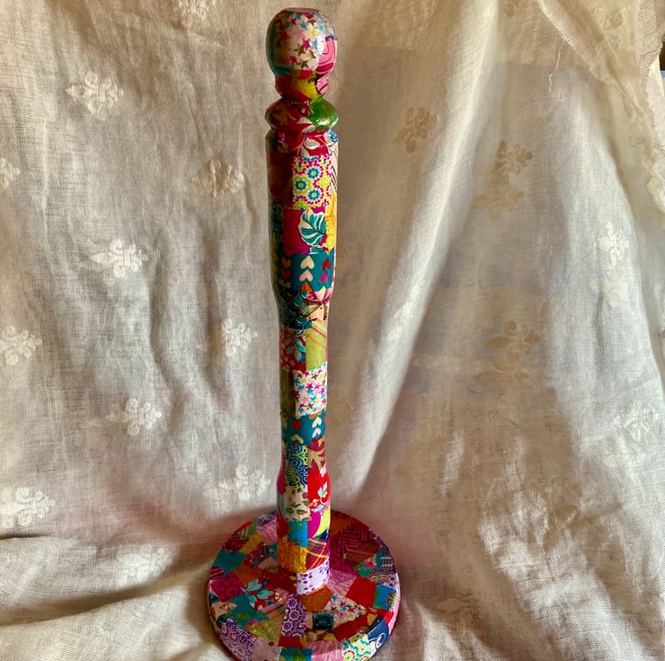 This is a wooden kitchen roll holder which has been up cycled using decopatch papers and then varnished.
