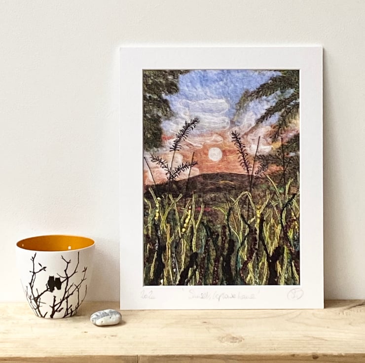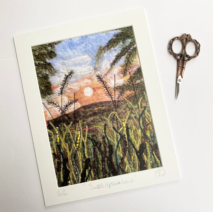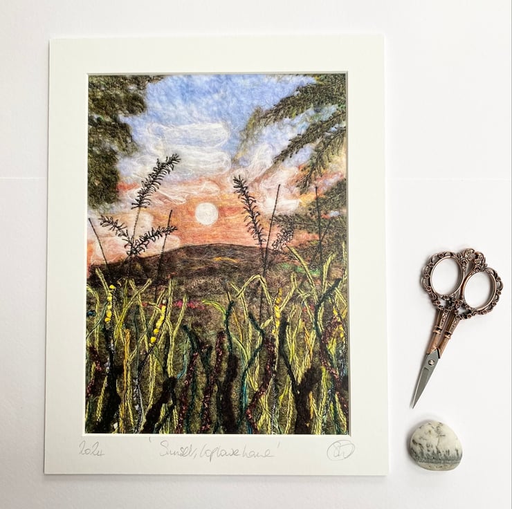 This stunning art piece is a print of one of my wet felted images of my village. The sun is setting over the moors, seen through a hedgerow of trees, grasses and plants.