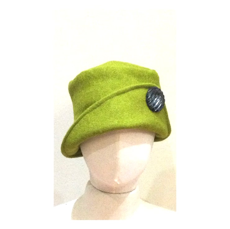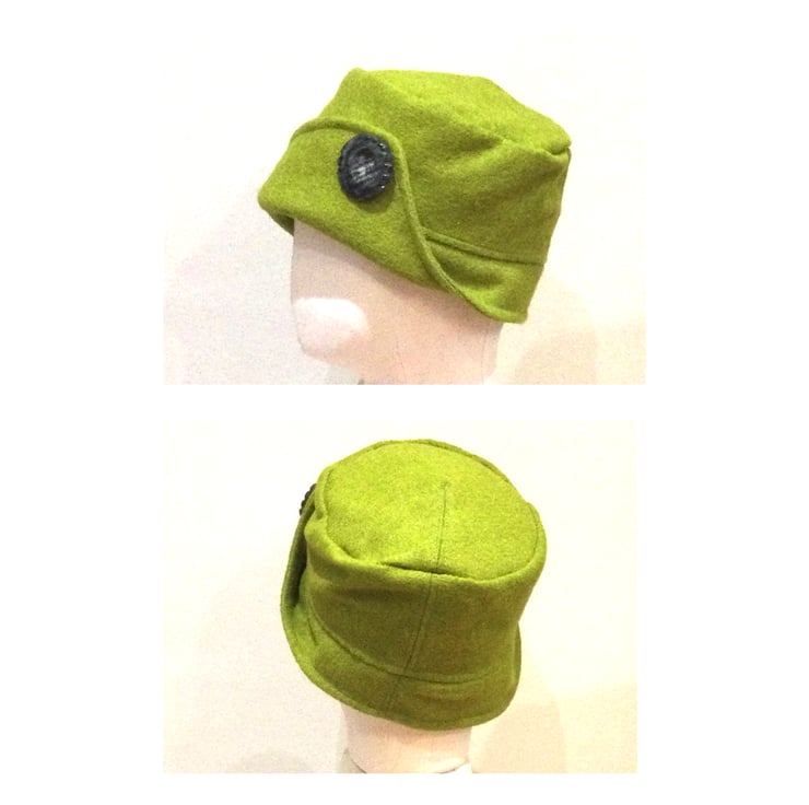 Wool rich cloche hat with button back brim. Fully lined . Made to fit average headsize 22.5 “. Soft and cosy ,can be folded flat and is easy to pack away.