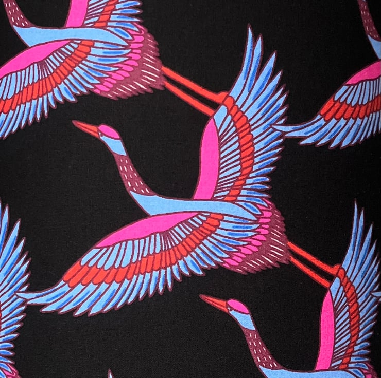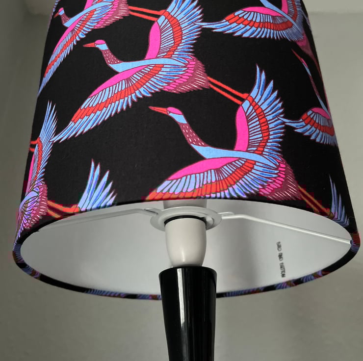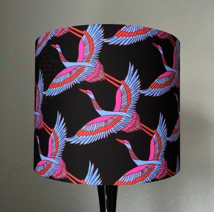 This shade features colourful flying cranes in blue, pink, and red on a black background.