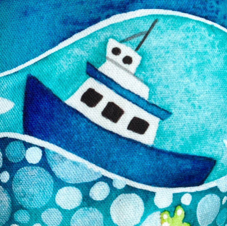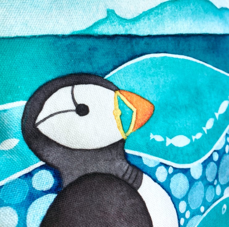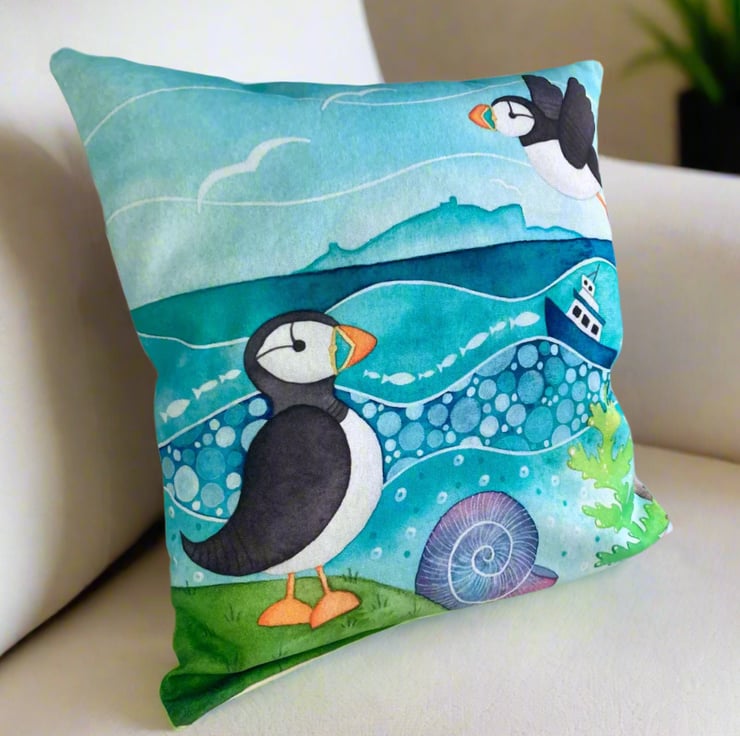 A big, beautiful cushion cover in top quality thick 100% cotton. This cushions features my cute puffin painting.The image shows two comical puffins showing off for the day-trippers on the Isle of May Princess with the Isle of May on the horizon.