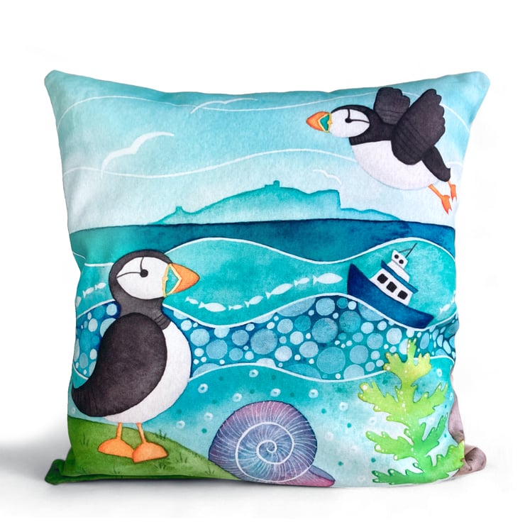 Cushion Cover - Puffins and the Isle of May Watercolour Painting