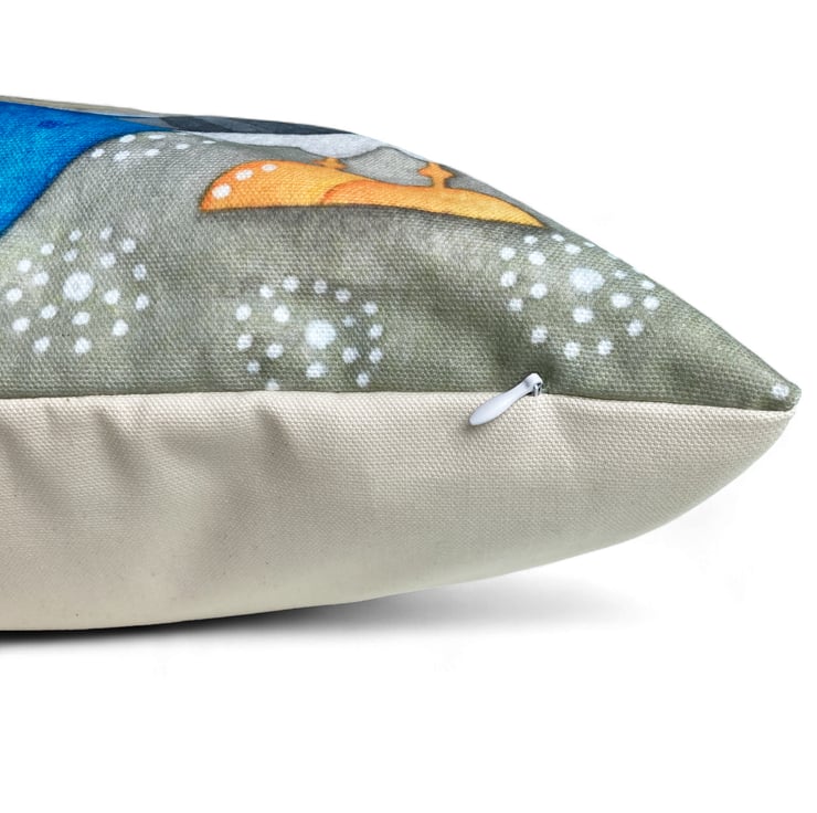 The cushion cover is printed in vibrant colours with a plain sky blue reverse to compliment the painting. It is made from 50% cotton and 50% polyester and measures 39cm square (15.5 inches). It would be ideal for a 16 inch square cushion inner and comes with a zipper.