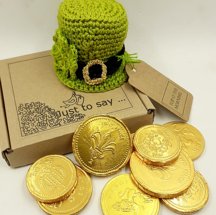 The hat is perfect for holding some chocolate coins ( not included) or simply on its own as an alternative to a St Patrick's Day card and keepsake decoration. It comes wrapped in tissue in a labelled PIP ( Postage in Proportion) box all ready to gift or post on.