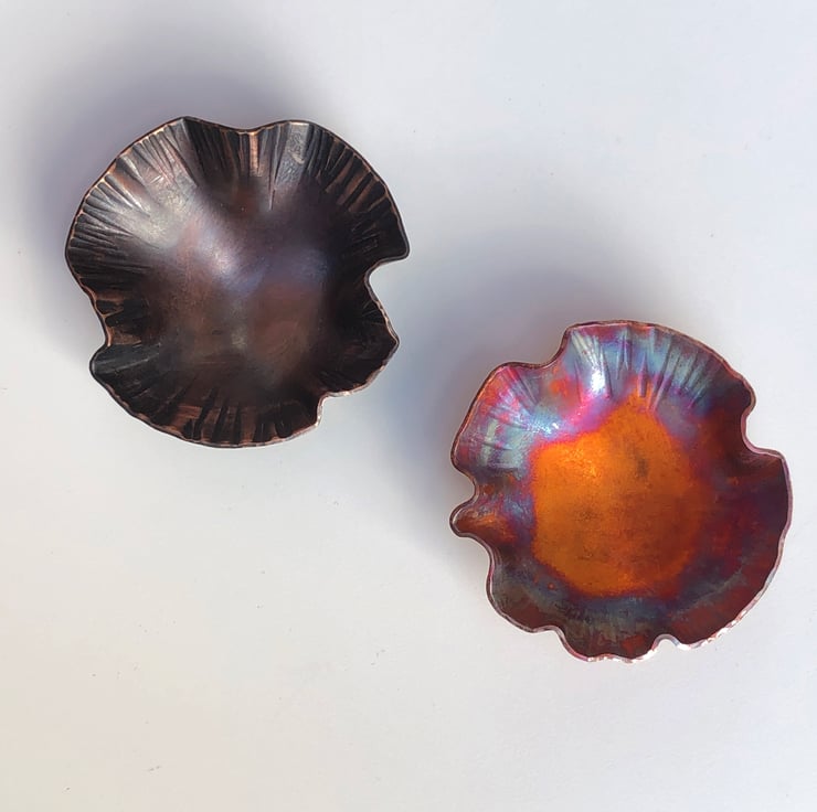 These tiny copper bowls are hand stamped and hammered, then formed from flat sheet into a bowl form. The colour is achieved with heat and is completely unique every time.