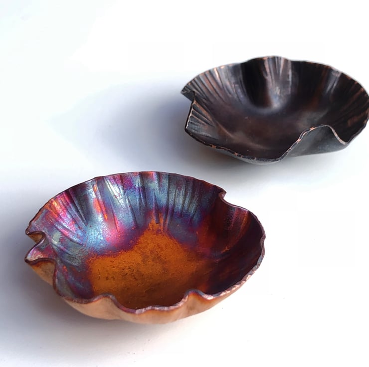 I love creating bowls and vessels from flat sheet metal using only a hand forming tools. Many of my larger vessels are created using the ancient technique of hammer raising, creating hollow forms from one piece with no solder seams. This is a time consuming technique so for smaller pieces I use hammers and forming punches making the process slightly quicker. I love to play with surface pattern and colour particularly with copper as there are so many possibilities.