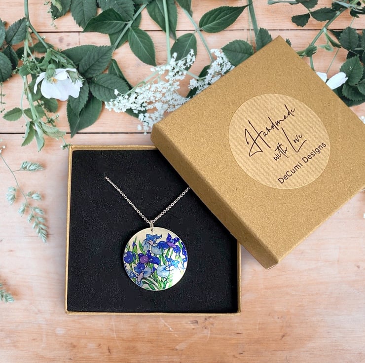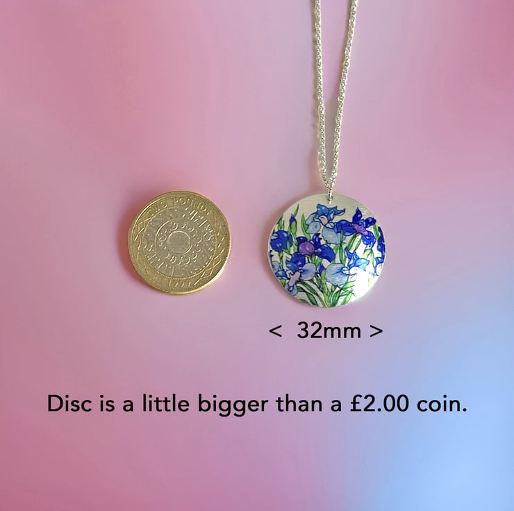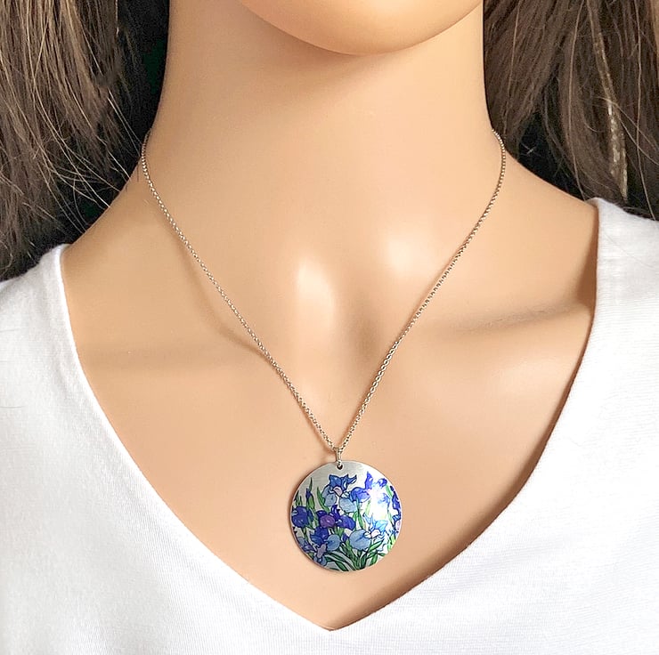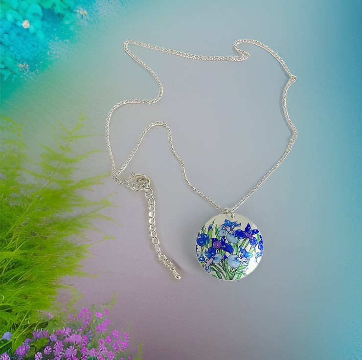 I made this pendant from aluminium, which I have hammered into a dome shape. You'll see that I've decorated it with a pretty blue/violet iris flowers design, and there is a choice of two chain lengths. Matching bracelets and earrings available, design 727b
