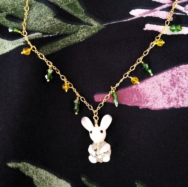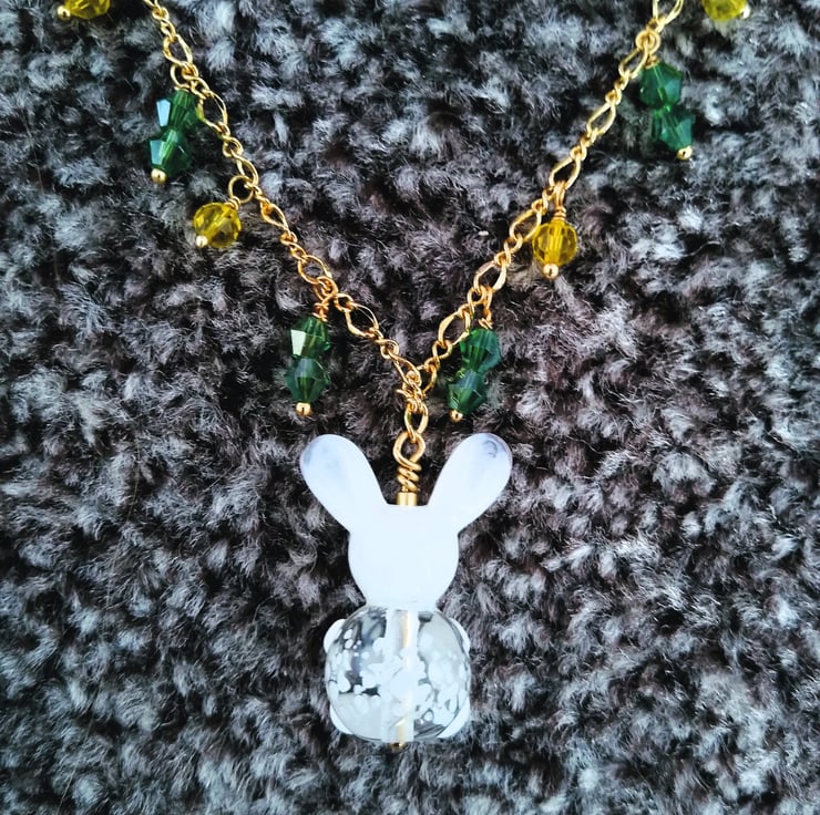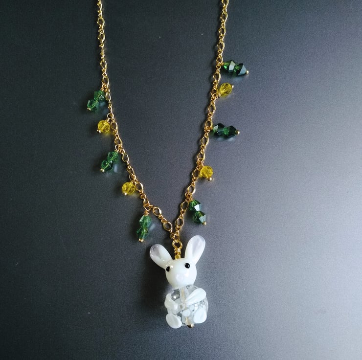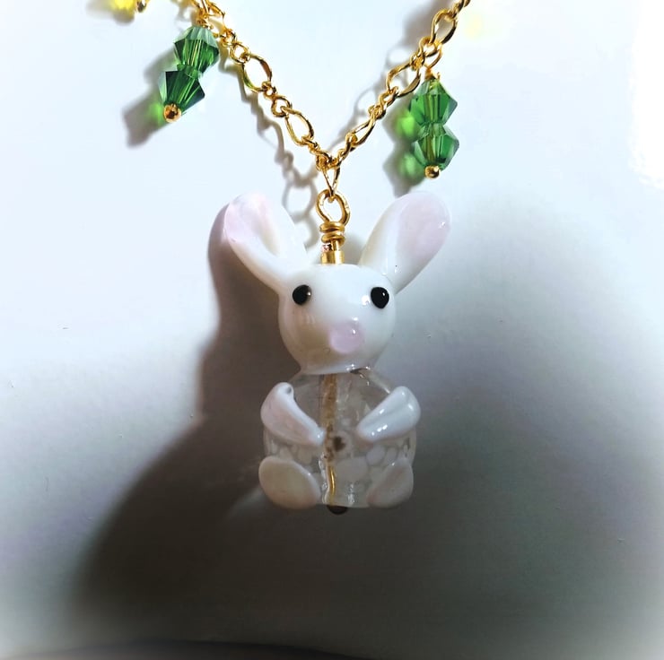 A whimsical, cute lampwork glass rabbit pendant on a gold plated figure eight chain, 18 inch long, with drops of faceted grass green and daffodil yellow glass beads.