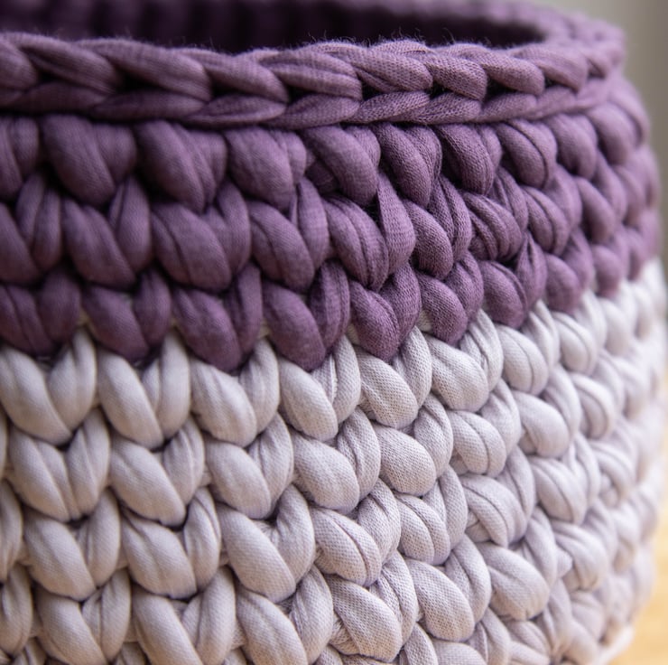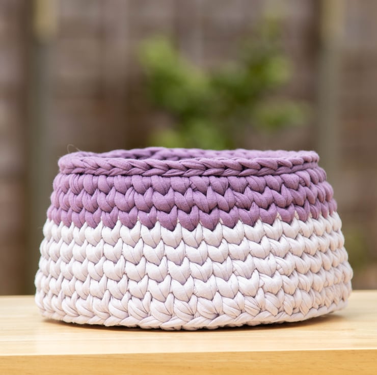 Handmade crocheted basket, approx. 7" in diameter and 4" deep, in two colours, lilac and purple