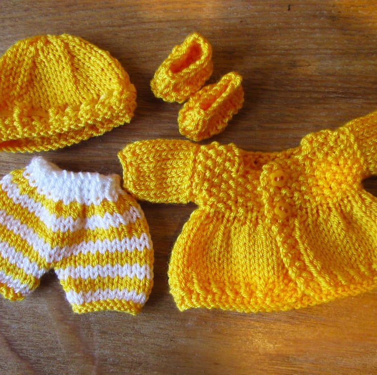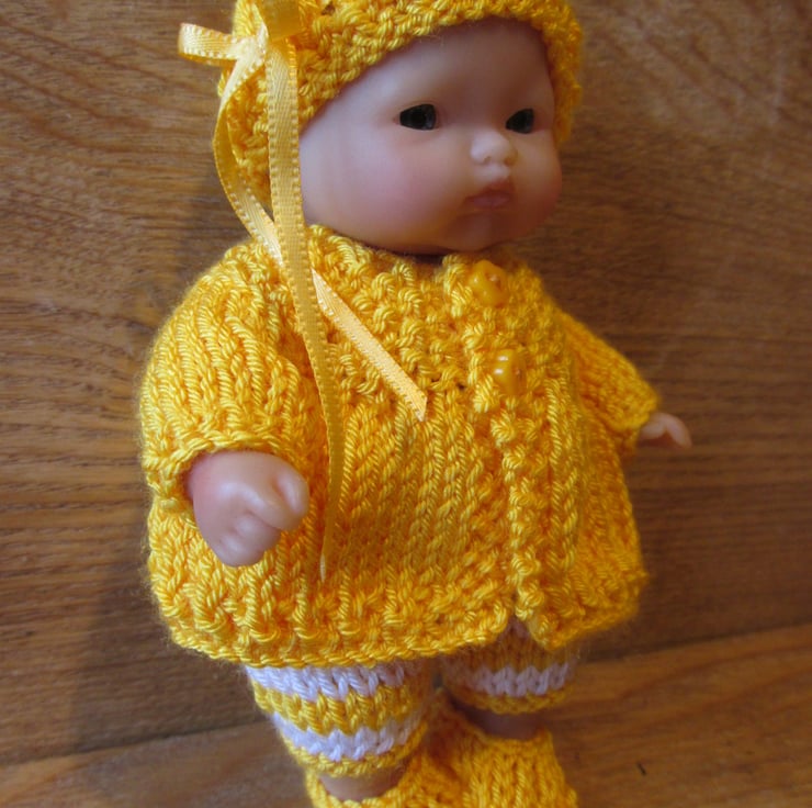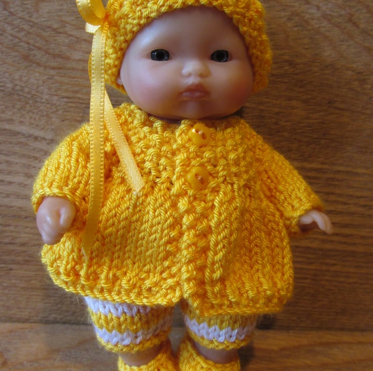 Hand made knitted outfit for a Berenguer 5 inch doll comprising coat, striped trousers, hat and shoes. Knitted in soft 4 ply acrylic yarn in a sunshine yellow colour with white contrast. The coat fastens with 2 buttons at the front to make it easy to put on and off the doll. You are buying the outfit only, the doll is not included.